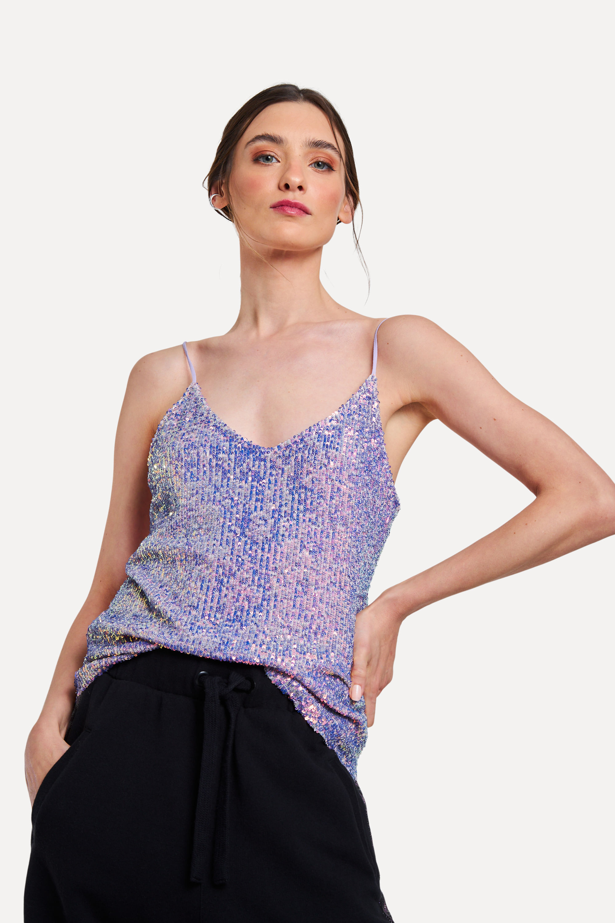 Perfeita para um look glam! A regata glam possui <b>alça com regulagem</b>, modelagem reta, solta, ajustada no busto e tecido maleável coberto de <b>lantejoulas</b>. Use com sobreposição, partes de baixo em jeans ou tecido nas suas produções.