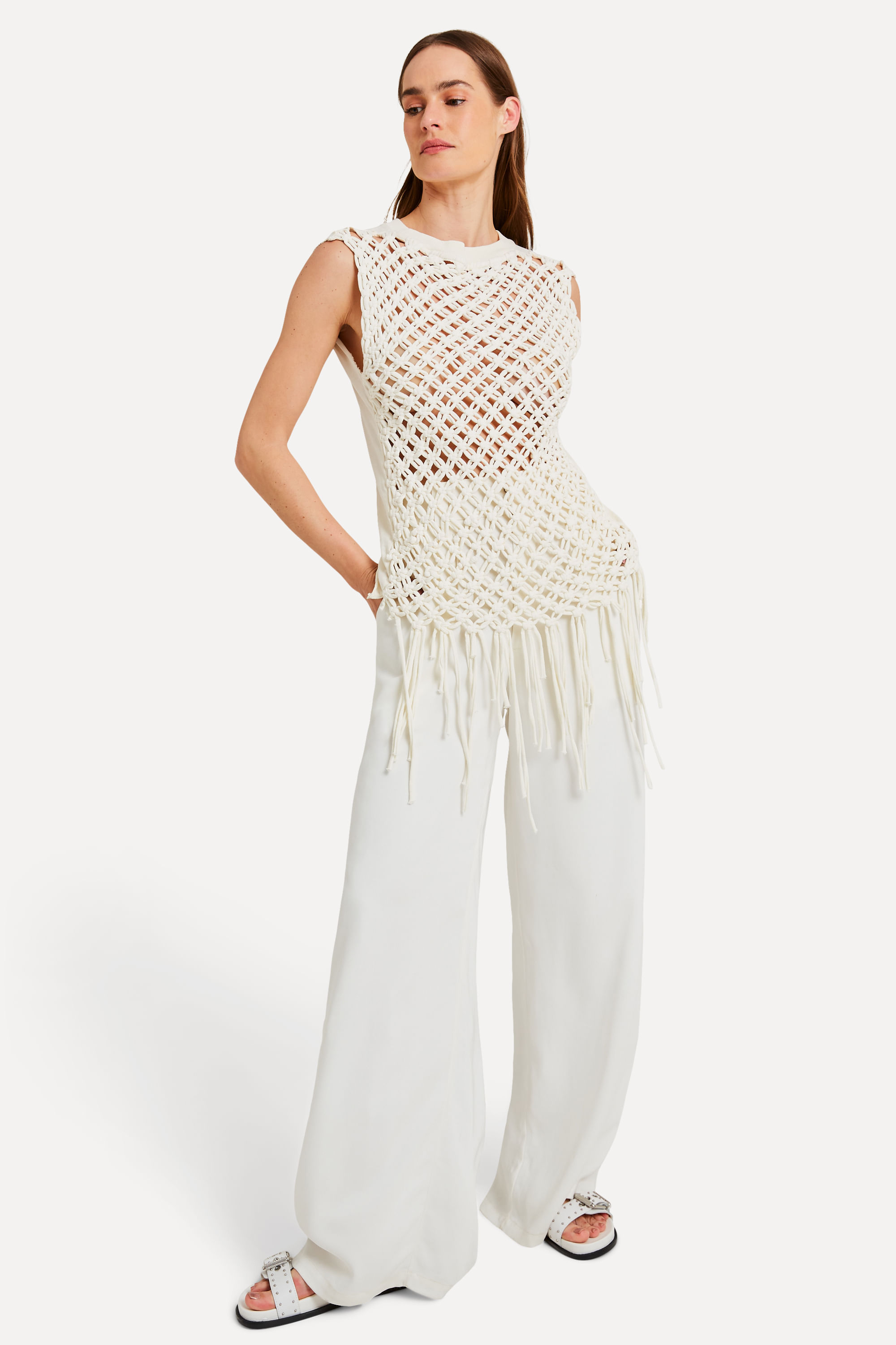 A Regata Malha Macramê da Reversa é uma peça versátil e cheia de estilo. Com modelagem clássica de regata e costas trabalhadas em macramê manual, esse detalhe artesanal traz um toque especial ao visual. Feita em malha atemporal de alta qualidade, essa regata pode ser usada tanto sozinha como com sobreposições, garantindo looks modernos e despojados. Seu tecido destaque é o que oferece conforto e durabilidade. Aposte nessa regata para compor produções únicas e cheias de personalidade. A modelo tem 1,77 de altura e 86 de busto. Comprando esta peça, você viabiliza cinco pratos de comida através do nosso Programa 1P5P. Produto produzido eticamente no Brasil.