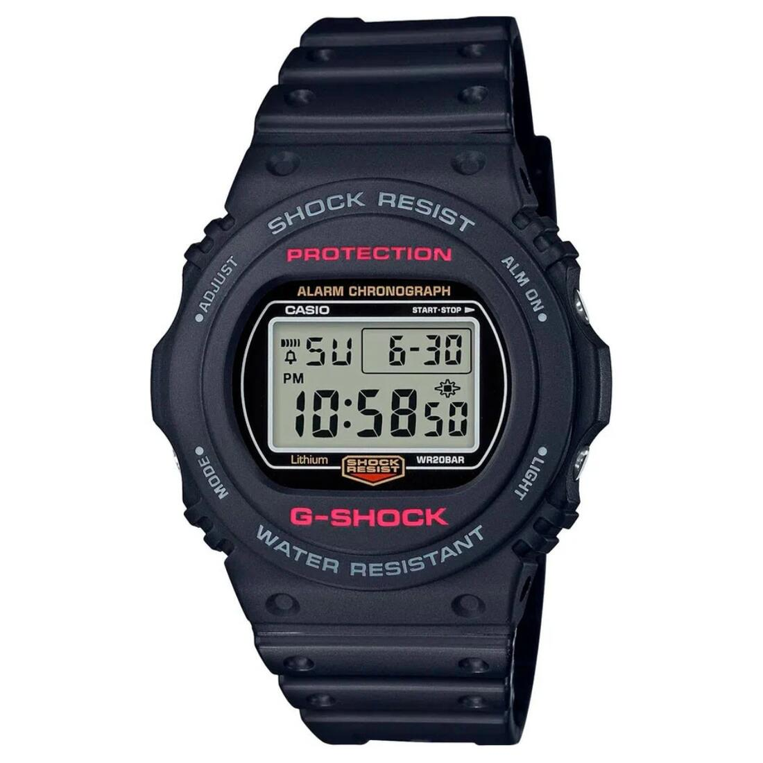 Relógio G-Shock DW-5750UE-1D Revival<br /> <br /> - Vidro mineral<br /> - Resistência a choques<br /> - Resistência à água 200m<br /> - Material da caixa/aro: resina<br /> - Pulseira em CORDURA <br /> - Fundo luminoso<br /> Persistência luminosa<br /> - Alerta piscante<br /> Pisca e soa para alarmes, sinalização a cada hora, alarme do cronômetro regressivo<br /> - Alarme<br /> - Cronômetro de 1/100 segundo<br /> Capacidade de medição: 00'00"00~59'59"99 (nos primeiros 60 minutos) e 1:00'00~23:59'59 (após 60 minutos)<br /> Unidade de medição: 1/100 segundo (nos primeiros 60 minutos) e 1 segundo (após 60 minutos)<br /> Modos de medição: Tempo transcorrido, divisão de tempo e os dois melhores tempos<br /> - Cronômetro regressivo<br /> Unidade de medição: 1 segundo<br /> Faixa de contagem: 24 horas<br /> Configuração inicial da faixa de contagem: 1 segundo a 24 horas (intervalos de 1 segundo, 1 minuto e 1 hora)<br /> Repetição automática<br /> - Alarmes multi-funcionais<br /> - Sinalização a cada hora<br /> - Calendário automático (até o ano 2039)<br /> - Formatos 12/24 horas<br /> - Horário regular: Hora, minuto, segundo, am/pm, mês, data, dia<br /> - Precisão: ±15 segundos por mês<br /> - Duração aproximada da bateria: 2 anos com CR2016<br /> - Tamanho: 48,9 X 45,4 X 13,4 mm<br /> - Peso total da caixa: 53g<br /> <br /> <br /> Sobre a Marca<br /> <br /> A G-Shock, da Casio, é uma marca de relógios famosa por sua durabilidade, design robusto e resistência a condições extremas. Lançada em 1983, combina tecnologia avançada com estilo urbano, sendo popular entre aventureiros, atletas e fãs de moda.<br /> <br /> Produto Original