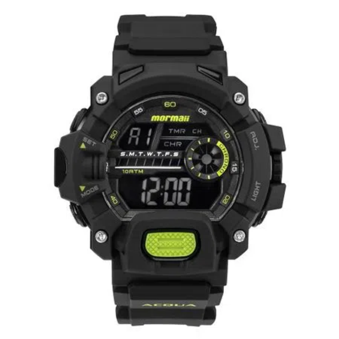Relógio Mormaii Lumi Digital Preto<br /> <br /> - Relógio da linha acqua a prova dágua 100m<br /> - Modelo digital todo <br /> - Material da pulseira é todo em polímero preto<br /> - Caixa de 54mm<br /> - Display negativo  <br /> <br />  <br /> Sobre a marca Mormaii<br /> <br /> Criada na década de 70 pelo brasileiro médico Morongo que gostava de surfar nas praias de Santa Catarina, a Mormaii se consagrou como uma marca nacional de roupas de borracha para surf. Rapidamente expandiu seus negócios para outras categorias como surf wear e acessórios mantendo sua base no life style do surf.<br /> <br /> <br /> Produto Original.