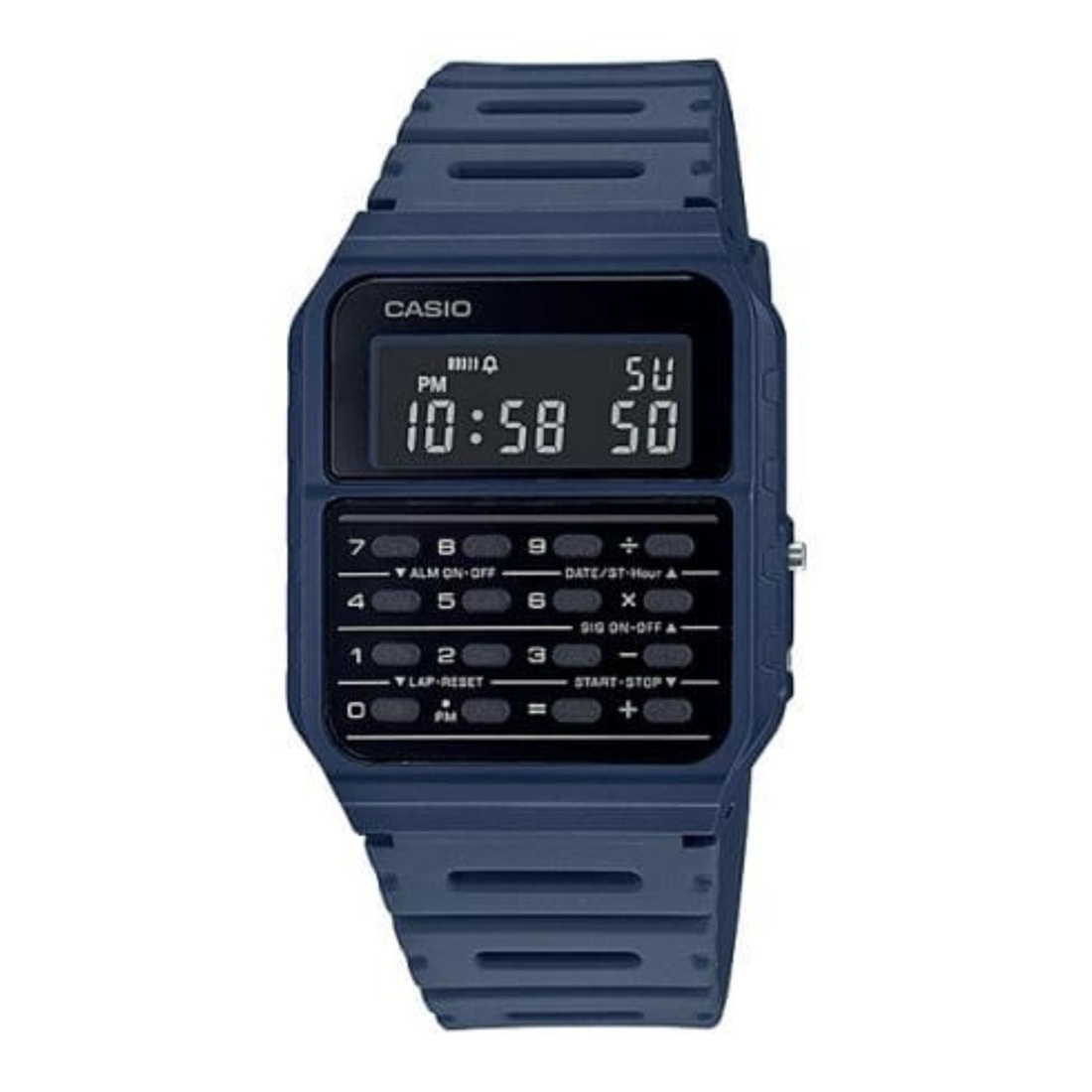 Relógio Casio Vintage Digital Calculadora Azul<br /> <br /> Informaçoes Basicas<br /> <br /> Tamanho da caixa (C × L × A) - 43.2 × 34.4 × 8.2 mm<br /> Peso - 25 g<br /> Material da caixa e da moldura - Material da moldura/caixa: Resina<br /> Pulseira - Pulseira em resina<br /> Resistente a água - Resistente à água<br /> Fonte de alimentação e autonomia da bateria - Duração aproximada da pilha: 5 anos em CR2016<br /> <br /> Exterior<br /> <br /> Vidro - Vidro com resina<br /> <br /> Recursos do Relógio<br /> <br /> Hora mundial - Hora dupla<br /> Cronômetro - Cronômetro de 1/100 de segundo Capacidade de medição: 23:59'59,99 Modos de medição: tempo decorrido, tempo parcial, tempos do 1º e 2º lugares<br /> Alarme/sinalização a cada hora - Alarme diário - Sinalização a cada hora<br /> Calendário - Calendário automático completo (até o ano de 2099)<br /> Recurso Mudo - Ativação e desativação do Som de operação dos botões<br /> Precisão - Precisão: ±15 segundos por mês<br /> Outros recursos<br /> Calculadora de 8 dígitos - Formatos de 12/24 horas<br /> Horário regular: Hora, minuto, segundo, am/pm, ano, mês, data, dia<br /> Produto Original.