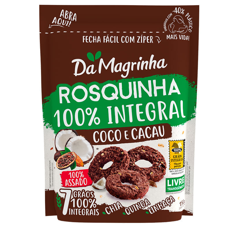 <p>A <strong>Rosquinha Integral Coco e Cacau</strong>, da <strong>Da Magrinha</strong>, é um biscoito 100% integral tipo rosquinha feito com 7 grãos, incluindo a chia, a quinoa e a linhaça</p> <p>Snack assado e livre de ingredientes transgênicos.</p> Alérgicos: <p>Contém trigo, aveia e centeio. Pode conter castanha-do-pará, amêndoas, castanha de caju, amendoim, pistache, macadâmia, avelã, soja, cevada e leite.</p> Sugestão de consumo: <p>Ideal para o café da manhã ou lanche entre as refeições.</p> Benefícios: <ul> <li>Assado</li> <li>100% integral</li> <li>1,9g de fibras</li> <li>Livre de transgênicos</li> </ul> A marca: <p>A Da Magrinha é a 1ª marca do Brasil com tudo 100% integral. Tudo 100% assado, com Certificado Internacional Whole Grain, livre de transgênicos, 7 grãos nobres, embalagens em stand up pouch com zíper que abre e fecha, e com 40% de redução de plásticos. Produtos artesanais, saudáveis, gostosos e integral de verdade!</p>