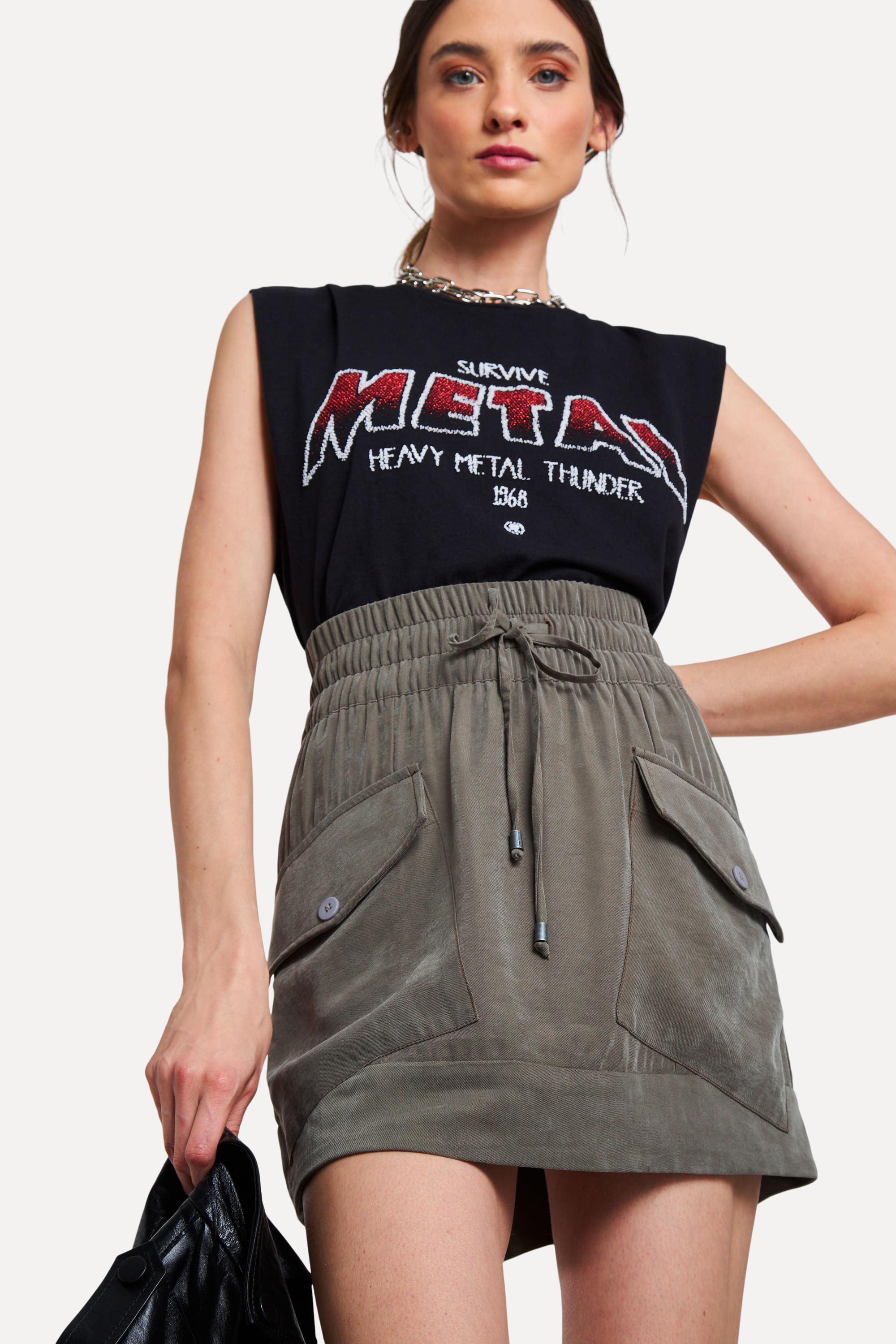 Casual and cool! A saia de alfaiataria militar possui modelagem solta, curta, <b>cintura alta com elástico</b> e um tecido maleável. Ideal para compor produções diurnas - com básicos e tênis - ou noturnas - com peças de tecido e salto ou bota.