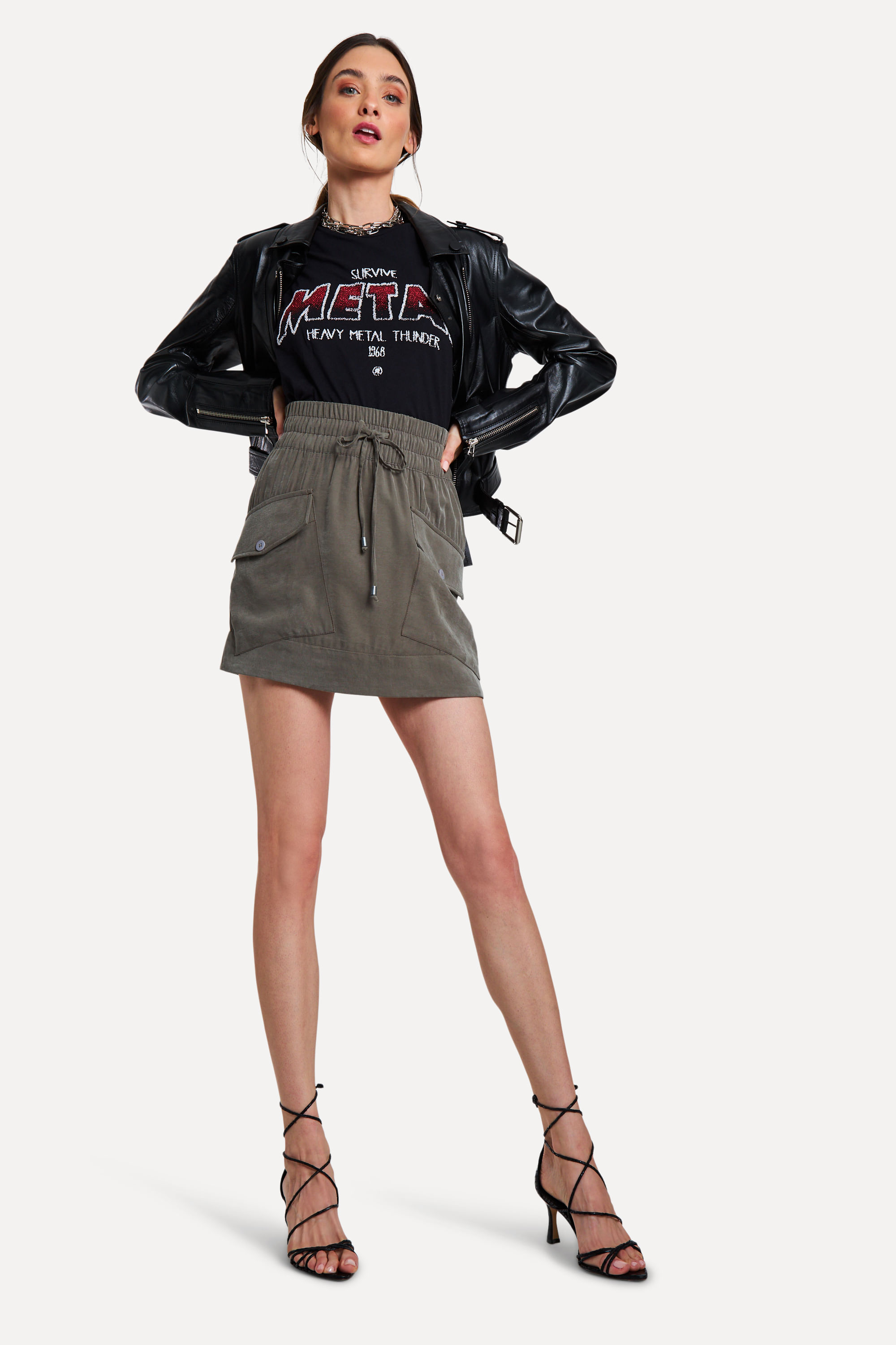 Casual and cool! A saia de alfaiataria militar possui modelagem solta, curta, <b>cintura alta com elástico</b> e um tecido maleável. Ideal para compor produções diurnas - com básicos e tênis - ou noturnas - com peças de tecido e salto ou bota.
