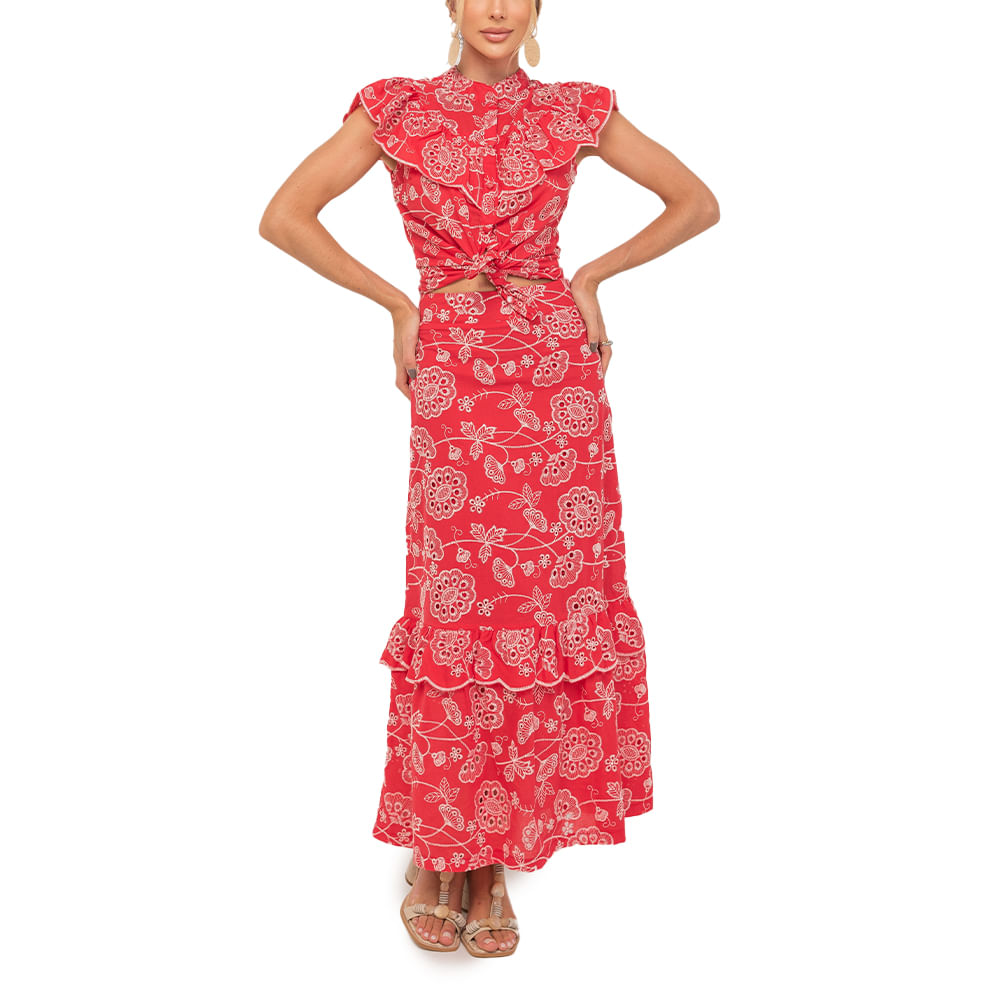 Saia feminina confeccionada em laise, um tecido com bordados florais; Modelo conta com cós alto e barra com babados em camadas; O bordado em flores traz feminilidade ao visual; As saias com babados são ultra femininas e podem ser usadas em um jantar romântico ou em um passeio no parque; Aposte com um cropped de linho colorido, sandálias rasteiras e bolsa tiracolo, para arrematar com casualidade; Os tecidos de laise são apostas da temporada e estão sendo usados por todas as trendsetters do momento; Invista na saia em laise para estar in fashion!<br><br><br>.<br><br><br>Produto : Saia Babados Laise Vermelho <br>Código : SAI2205VER<br>Categoria: Saia<br>Cor: Vermelha <br>Tecido: Laise Bordado <br>Composição: 20 % Poliester / 80% Poliester <br>Comprimento: Longo<br>Peso: 300 g<br>Gênero: Feminino<br>Marca: Vértice<br>.<br><br><br><br>Medidas.<br><br><br><br>P - Busto até 90 cm l Cintura até 71 cm l Quadril até 99 Cm.<br>M - Busto até 96 cm l Cintura até 77 cm l Quadril até 102 cm.<br>G - Busto até 102 cm l Cintura 83 cm l Quadril 111 cm.<br>GG - Busto 108 cm l Cintura até 89 cm l Quadril até 117 cm.<br>EGG - Busto até 114 cm l Cintura até 95 cm l Quadril até 123 cm.<br><br><br><br><br><br><br><br><br><br><br><br><br><br><br><br><br><br><br><br><br><br><br><br><br><br><br><br><br><br><br><br>