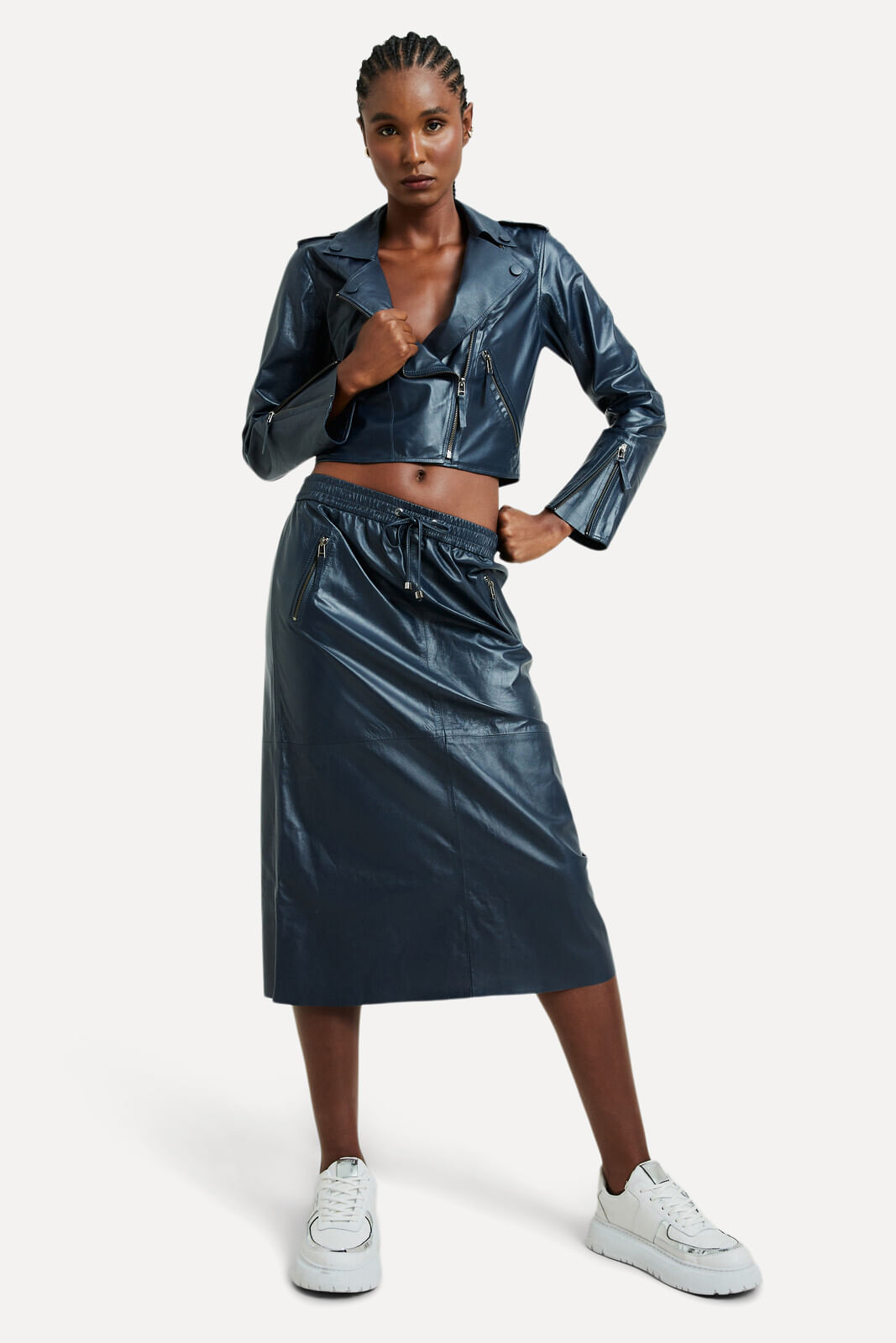 A Saia de Couro Midi Cós Elástico é confeccionada pensando no conforto da mulher. Seu cós é feito em elástico super anatômico, que se ajusta perfeitamente ao corpo, conferindo um ar esportivo. Pode ser usada com nossas camisetas de malha, camisa jeans, sarja ou tecido, ou blusas de couro. O couro traz uma pegada mais urbana e sofisticada à produção. Saia Feminina Reversa produzida eticamente no Brasil. Comprando esta peça, você viabiliza cinco pratos de comida através do nosso programa 1P5P. A modelo mede 1,82 m, 62 cm de cintura e 89 cm de quadril.