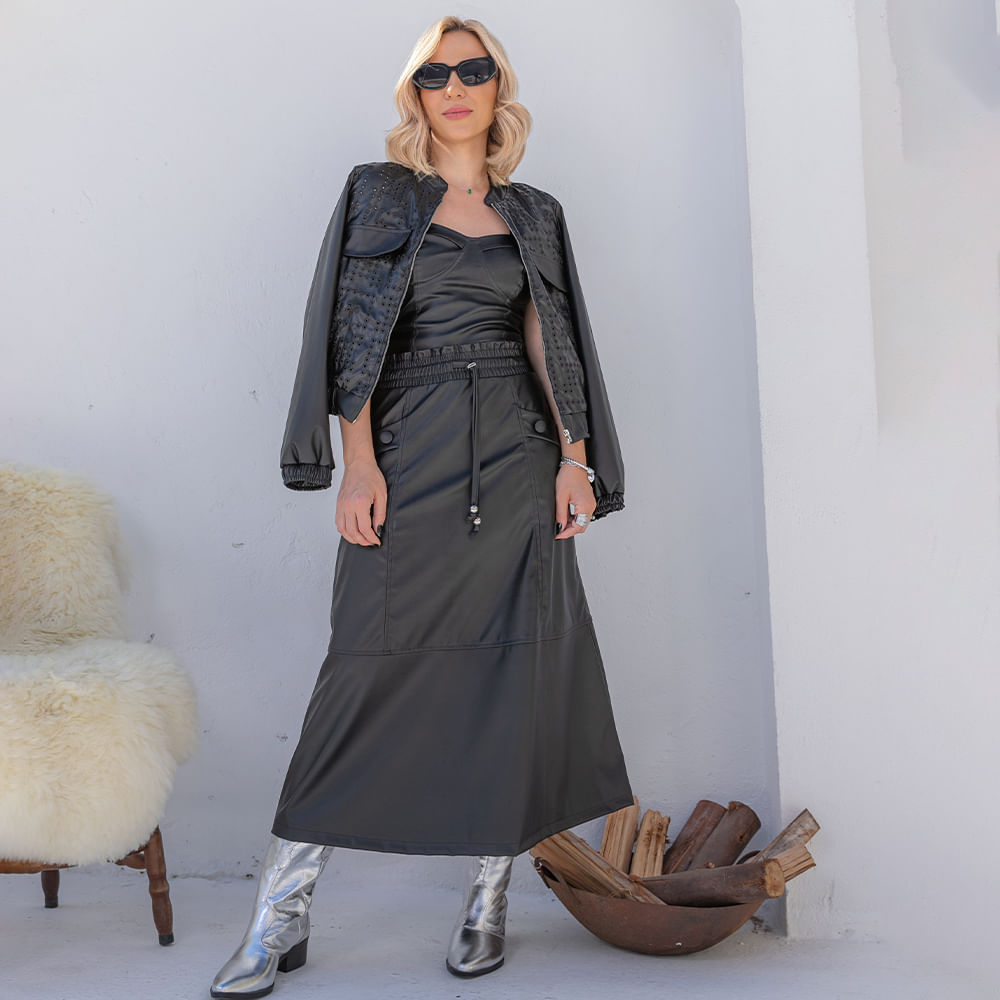 A saia Midi de Couro possui comprimento midi, modelagem evasê, bolsos laterais, ajuste com regulador, na cintura, elástico na cintura, ponteiras de metal nos cordões, recorte na barra; A saia midi de couro é uma peça versátil e elegante que pode ser usada em diversas ocasiões, desde eventos formais até o dia a dia; A saia midi tem comprimento abaixo do joelho e é um modelo que valoriza diferentes tipos de corpo, além de ser uma opção confortável e estilosa; Uma forma de usar a saia midi de couro é combiná-la com uma blusa mais justa, como uma regata, top ou uma camiseta cropped; Essa combinação cria um contraste interessante entre a elegância do couro e a simplicidade da blusa justa, além de valorizar a cintura e as curvas do corpo; Uma tendência de moda atual para a saia midi de couro é o uso de modelagens mais amplas e fluidas, que trazem um ar mais descontraído e moderno para a peça, criando um efeito visual interessante e um movimento fluido ao andar;<br><br><br>.<br><br>Produto : Saia Midi Couro Preto <br>Código : SAI2208PRT<br>Categoria: Saia<br>Cor: Preto<br>Tecido: Couro Ecologico <br>Composição: 100% poliester<br>Comprimento: Longo<br>Peso: 300 g<br>Gênero: Feminino<br>Marca: Vértice<br><br>Medidas.<br><br>P - Busto até 90 cm l Cintura até 71 cm l Quadril até 99 Cm.<br>M - Busto até 96 cm l Cintura até 77 cm l Quadril até 102 cm.<br>G - Busto até 102 cm l Cintura 83 cm l Quadril 111 cm.<br>GG - Busto 108 cm l Cintura até 89 cm l Quadril até 117 cm.<br>EGG - Busto até 114 cm l Cintura até 95 cm l Quadril até 123 cm.<br><br><br><br><br><br><br><br><br>