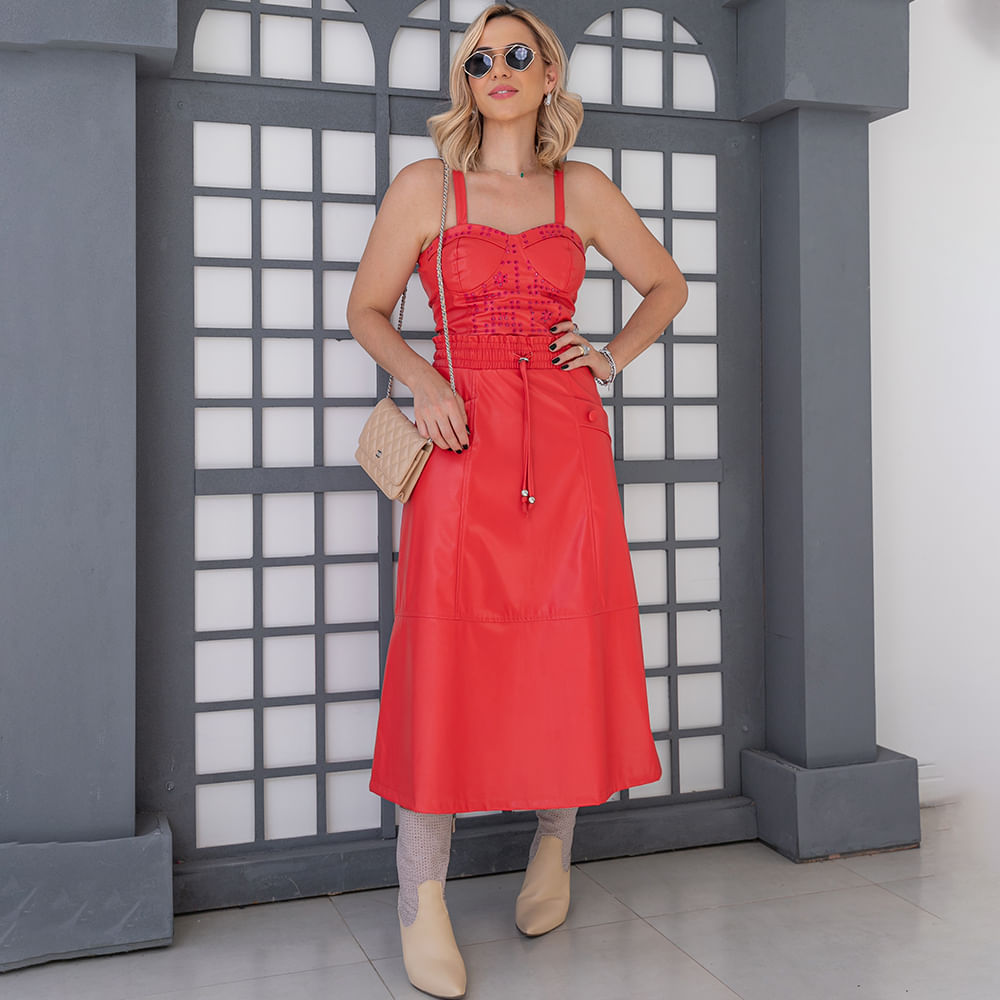 A saia Midi de Couro possui comprimento midi, modelagem evasê, bolsos laterais, ajuste com regulador, na cintura, elástico na cintura, ponteiras de metal nos cordões, recorte na barra; A saia midi de couro é uma peça versátil e elegante que pode ser usada em diversas ocasiões, desde eventos formais até o dia a dia; A saia midi tem comprimento abaixo do joelho e é um modelo que valoriza diferentes tipos de corpo, além de ser uma opção confortável e estilosa; Uma forma de usar a saia midi de couro é combiná-la com uma blusa mais justa, como uma regata, top ou uma camiseta cropped; Essa combinação cria um contraste interessante entre a elegância do couro e a simplicidade da blusa justa, além de valorizar a cintura e as curvas do corpo; Uma tendência de moda atual para a saia midi de couro é o uso de modelagens mais amplas e fluidas, que trazem um ar mais descontraído e moderno para a peça, criando um efeito visual interessante e um movimento fluido ao andar;<br><br><br>.<br><br>Produto : Saia Midi Couro Vermelho<br>Código : SAI2208VER<br>Categoria: Saia<br>Cor: Vermelho<br>Tecido: Couro Ecologico <br>Composição: 100% poliester<br>Comprimento: Longo<br>Peso: 300 g<br>Gênero: Feminino<br>Marca: Vértice<br><br>Medidas.<br><br>P - Busto até 90 cm l Cintura até 71 cm l Quadril até 99 Cm.<br>M - Busto até 96 cm l Cintura até 77 cm l Quadril até 102 cm.<br>G - Busto até 102 cm l Cintura 83 cm l Quadril 111 cm.<br>GG - Busto 108 cm l Cintura até 89 cm l Quadril até 117 cm.<br>EGG - Busto até 114 cm l Cintura até 95 cm l Quadril até 123 cm.<br><br><br><br><br><br><br><br><br>