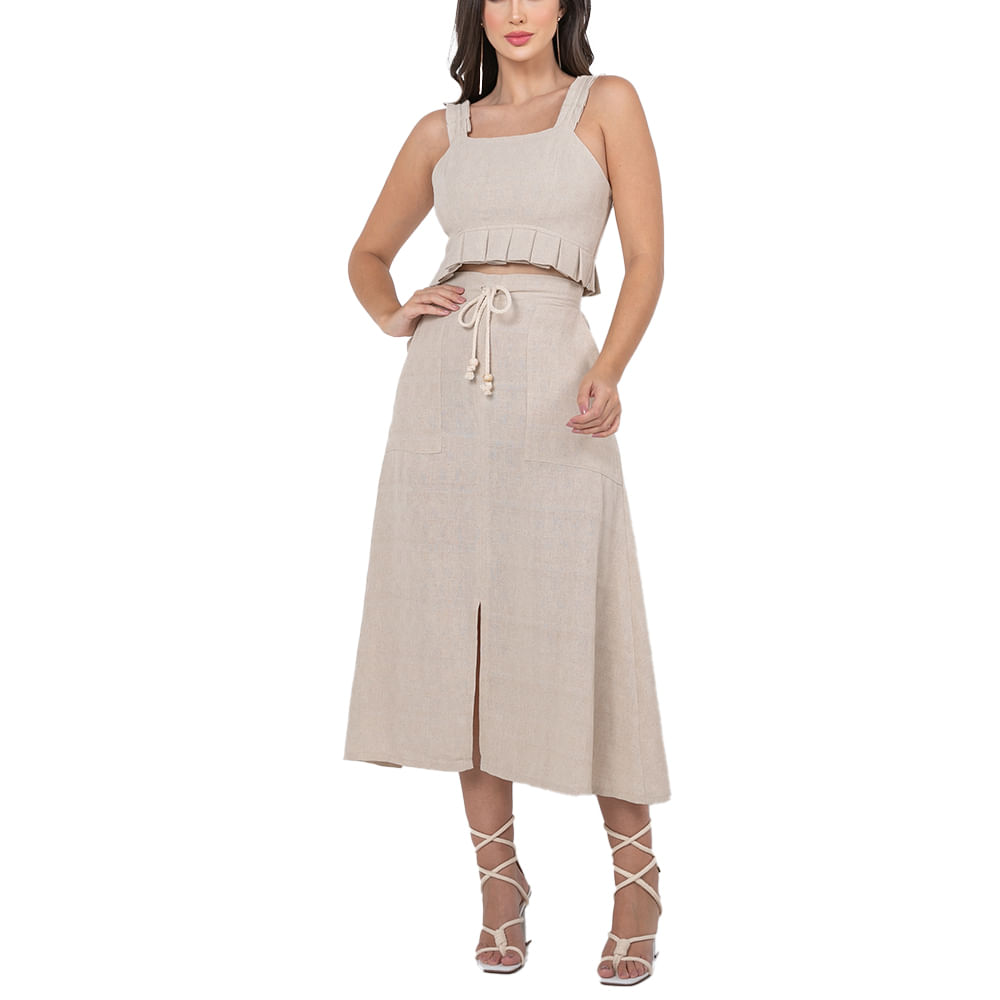 Saia feminina confeccionada em linho, um tecido leve e com ótima durabilidade; Possui modelagem midi com caimento em evasê e fenda frontal; O modelo conta com cós alto aplicado, cordão frontal e bolsos laterais; A saia midi é uma peça que traz feminilidade á qualquer produção e pode ser usada com blusas, camisas e croppeds; Para um visual de verão, invista em um cropped com detalhes bordados e arremate com sandálias de fibras naturais; O linho é o tecido favorito estação e estão nos looks das fashionistas antenadas nas últimas tendências, aposte na saia midi em linho para um visual fresh e casual!<br><br><br>.<br><br>Produto : Saia Midi Linho Nude<br>Código : SAI2206NUD<br>Categoria: Saia<br>Cor: Nude<br>Tecido: Linho<br>Composição: 11% viscose / 43% poliester / 15% linho / 31% algodão <br>Comprimento: Longo<br>Peso: 300 g<br>Gênero: Feminino<br>Marca: Vértice<br><br>Medidas.<br><br><br>P - Busto até 90 cm l Cintura até 71 cm l Quadril até 99 Cm.<br>M - Busto até 96 cm l Cintura até 77 cm l Quadril até 102 cm.<br>G - Busto até 102 cm l Cintura 83 cm l Quadril 111 cm.<br>GG - Busto 108 cm l Cintura até 89 cm l Quadril até 117 cm.<br>EGG - Busto até 114 cm l Cintura até 95 cm l Quadril até 123 cm.<br><br><br><br><br><br><br><br><br><br><br><br><br><br><br><br><br><br><br><br><br><br><br><br><br><br><br><br><br><br>