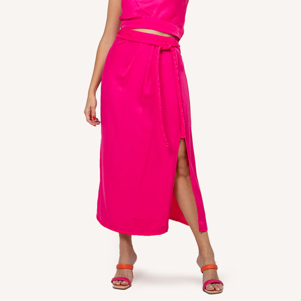 Saia feminina confeccionada em tecido de viscose acetinada; Modelagem midi, com altura nos tornozelos e detalhe de fenda lateral; Modelo possui cintura alta e cordão para amarração; As saias midi são peças versáteis, em especial quando são lisas; Para um visual com a cara da temporada, aposte em um top cropped estampado, sandálias de salto bloco e arremate com os acessórios coloridos e descontraídos, para um visual criativo e moderno; A saia midi feminina é um must have no guarda-roupa de toda fashionistas; Invista nas saias femininas coloridas para suas produções desta temporada!<br><br>.<br><br>Produto: Saia Transpassada Cetim Pink<br>Categoria: Saia<br>Cor: Pink <br>Tecido: Viscose Acetinada<br>Composição: 50,6% viscose / 49,4% poliester<br>Comprimento: Longo<br>Peso: 300 g<br>Gênero: Feminino<br>Marca: Vértice<br>.<br><br><br>Medidas.<br><br>P - Busto até 90 cm l Cintura até 71 cm l Quadril até 99 Cm.<br>M - Busto até 96 cm l Cintura até 77 cm l Quadril até 102 cm.<br>G - Busto até 102 cm l Cintura 83 cm l Quadril 111 cm.<br>GG - Busto 108 cm l Cintura até 89 cm l Quadril até 117 cm.<br>EGG - Busto até 114 cm l Cintura até 95 cm l Quadril até 123 cm.<br><br>