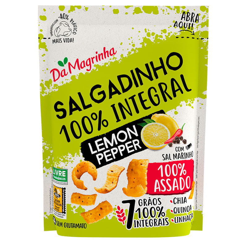 <p>O <strong>Salgadinho Integral Lemon Pepper</strong>, da <strong>Da Magrinha</strong>, é feito com 7 grãos 100% integrais, incluindo a chia, quinoa e linhaça, com um toque de sal marinho. Snack assado, livre de ingredientes transgênicos e sem glutamato.</p> Alérgicos: Contém trigo. Pode conter centeio, aveia, cevada, leite, amêndoas, castanha de caju, castanha do Pará, soja, amendoim, pistache, macadâmia e avelã. Recomendação de consumo: <p>Ideal para o lanche entre as refeições.</p> Por que escolher este produto? <p>· Assado</p> <p>· 100% integral</p> <p>· Sem glutamato</p> <p>· 1,5g de fibras</p> <p>· Livre de transgênicos</p> <p>· Com sal marinho</p> Sobre a marca: <p>A Da Magrinha é a 1ª marca do Brasil com tudo 100% integral. Tudo 100% assado, com Certificado Internacional Whole Grain, livre de transgênicos, 7 grãos nobres, embalagens em stand up pouch com zíper que abre e fecha, e com 40% de redução de plásticos. Produtos artesanais, saudáveis, gostosos e integral de verdade!</p>