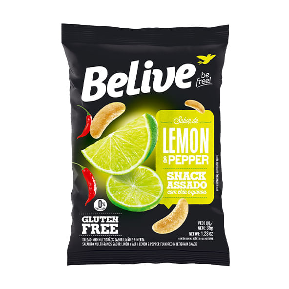 Informações técnicas do produto: <br> O Salgadinho sem Glúten Lemon e Pepper, da Belive, contém 35g, é uma deliciosa opção de snack sem glúten, podendo ser consumido por pessoas com doença celíaca ou que desejam optar por um salgadinho mais saudável, sem ser frito e com baixo teor de sódio.<br> <br> <br> <br> Recomendação de consumo:<br> Pode ser consumido em lanches intermediários ou a qualquer hora do dia.<br> <br> Informações sobre alérgicos:<br> Contém derivados de soja.<br> <br> Por que escolher esse produto?<br> Snack assado com chia e quinoa<br> Não contém glúten<br> Isento de lactose<br> Sal light<br> Sobre a marca:<br> A Belive, é uma empresa que acredita que para ser livre, é preciso ter escolhas saudáveis e saborosas, mas sem abrir mão do sabor. É ser livre para cuidar da saúde sem exageros, por isso é necessário abrir espaço para a alegria e a liberdade de comprar o que realmente gosta, e consumir o produto sem ter medo ou culpa.