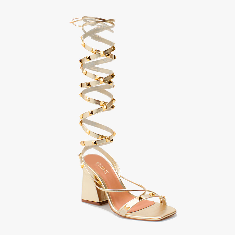 Sandália gladiadora feminina confeccionada em material de napa e forro sintético; Modelo conta com cabedal em tira única, tiras gladiadoras que sobem ao longo das pernas e fechamento por amarração; Detalhe de aplicação de tachas douradas ao longo da sandália, trazendo modernidade ao seu visual; Possui bico quadrado, salto bloco com 9,0 cm de altura e solado em microgel, que garante maior durabilidade ao calçado; As gladiadoras femininas são perfeitas para um visual poderoso e muito feminino; Nossa dica é usar comprimentos curtos ou midis para que a sandália permaneça em evidência com suas tiras; Aposte em saias, short, bermudas, vestidos e, até mesmo, calças com comprimento cropped e arremate com blusas modernas; As sandálias gladiadoras são os modelos mais usados e adorados pelas brasileiras que estão sempre por dentro das melhores trends de moda; A sandália preta gladiadora é o modelo ideal para quem busca um look empoderado e com toque de sensualidade, na medida certa, aposte!<br><br><br>.<br><br>Produto : Sandália Amarração Spikes Ouro<br>Categoria: Sandalia<br>Tipo de Salto: Salto alto<br>Altura do Salto: 9 cm<br>Tipo de Bico: Quadrado<br>Material Externo: NAPA<br>Solado: MICROGEL<br>Forma : Normal compre a que costuma usar<br>Peso:0,536g<br>Cor: Ouro<br>Gênero: Feminino.<br><br><br><br>Marca: Vértice <br> <br><br>