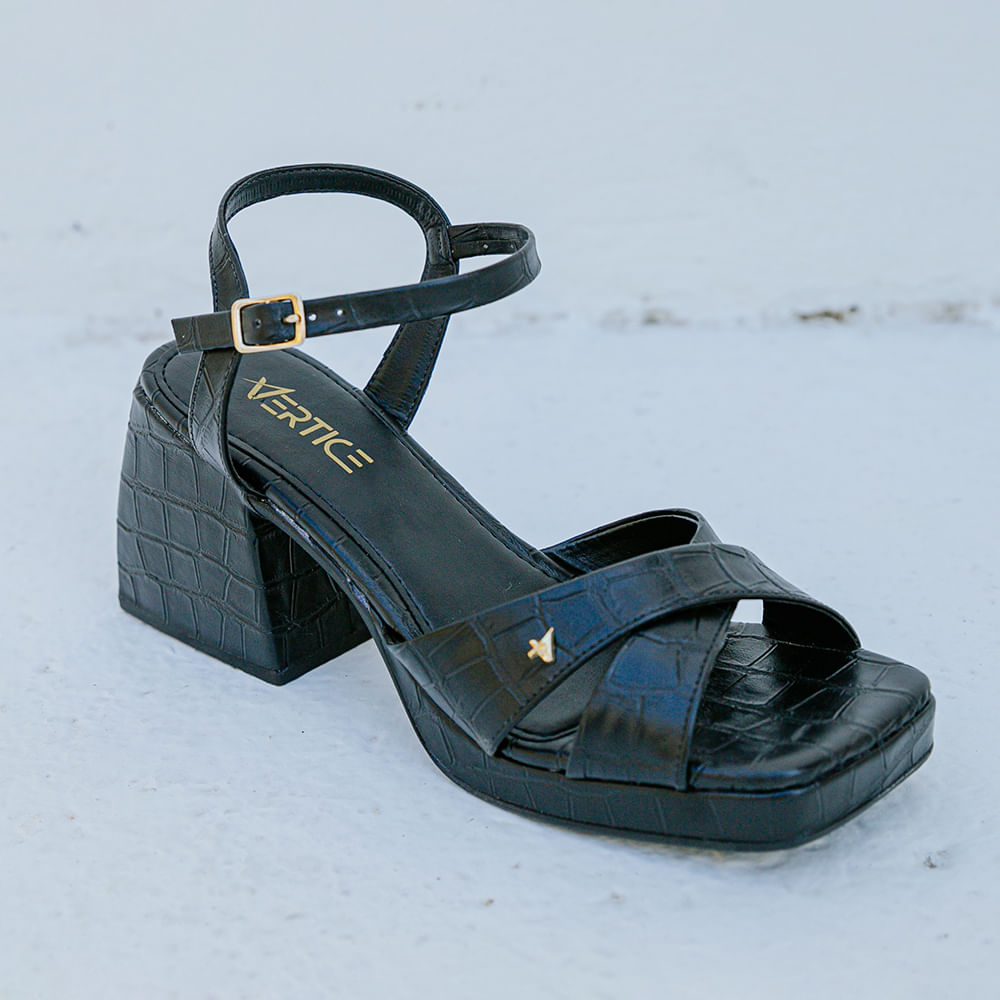 Sandália feminina confeccionada em couro sintético e forro sintético; Modelo conta com acabamento texturizado em croco e salto bloco médio de 8 cm de altura; Possui bico quadrado, fechamento por fivela, solado em micro com ótima durabilidade e detalhe de logo da marca frontal em dourado; As sandálias de salto bloco são sempre muito confortáveis; Combine sua sandália texturizada com uma calça pantalona fluida e um colete de alfaiataria para um visual moderno; As texturas deixam o visual muito mais interessante, por isso o acabamento em croco é o favorito das it girls do momento; <br><br>.<br><br>Produto : Sandália Couro Texturas Salto Bloco Médio Meia Pata Preto <br>Categoria: Sandália<br>Tipo de Salto: Grosso<br>Altura do Salto: 8 cm<br>Tipo de Bico: Quadrado<br>Material Externo: Sintético <br>Peso: 0,142g<br>Solado: MICRO<br>Forma : Normal compre a sua numeração que costuma usar<br>Cor: Preto<br>Gênero: Feminino<br>Marca: Vértice<br>