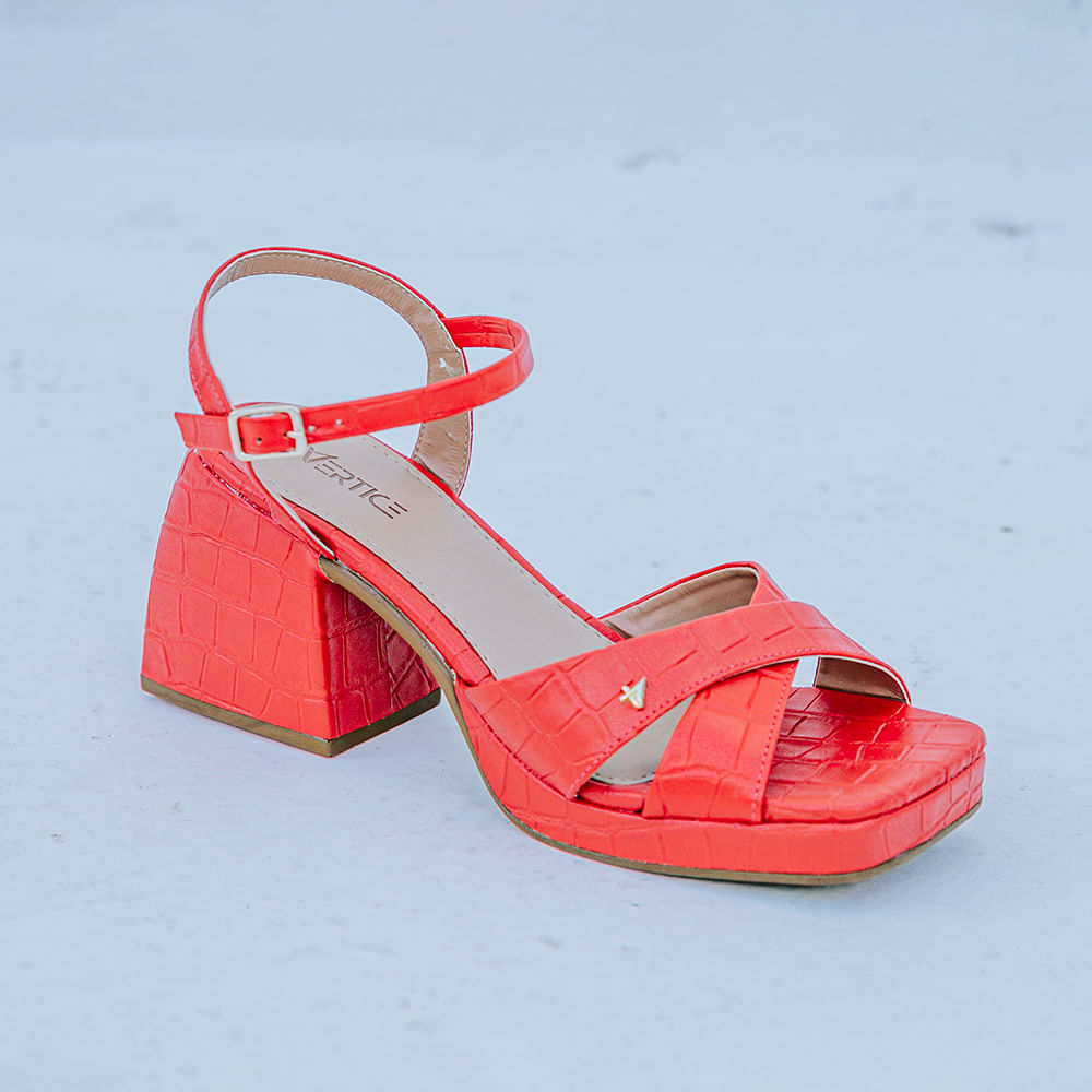 Sandália feminina confeccionada em couro sintético e forro sintético; Modelo conta com acabamento texturizado em croco e salto bloco médio de 8 cm de altura; Possui bico quadrado, fechamento por fivela, solado em micro com ótima durabilidade e detalhe de logo da marca frontal em dourado; As sandálias de salto bloco são sempre muito confortáveis; Combine sua sandália texturizada com uma calça pantalona fluida e um colete de alfaiataria para um visual moderno; As texturas deixam o visual muito mais interessante, por isso o acabamento em croco é o favorito das it girls do momento; <br><br>.<br><br>Produto : Sandália Couro Texturas Salto Bloco Médio Meia Pata Frenesi <br>Categoria: Sandália<br>Tipo de Salto: Grosso<br>Altura do Salto: 8 cm<br>Tipo de Bico: Quadrado<br>Material Externo: Sintético <br>Peso: 0,142g<br>Solado: MICRO<br>Forma : Normal compre a sua numeração que costuma usar<br>Cor: Frenesi ( Coral)<br>Gênero: Feminino<br>Marca: Vértice<br>