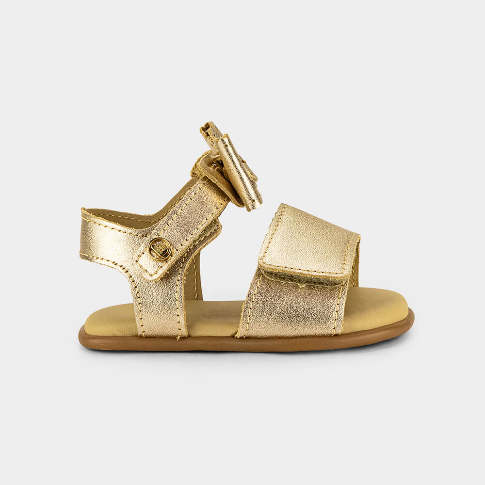 Descubra a sandália infantil feminina perfeita para o seu bebê! Confeccionada em **couro** metalizado dourado, ela é deal para todas as ocasiões! <br> Esta sandália infantil oferece dois fechamentos em tira, garantindo um ajuste fácil e seguro, protegendo os pezinhos e permitindo que se desenvolvam de maneira natural. Este modelo não é apenas elegante, mas também extremamente prático e seguro. <br> Além de todos esses benefícios, a sandália conta com um detalhe super delicado e charmoso: um laço removível no cabedal. Esse toque especial adiciona um charme extra ao visual do seu bebê, tornando-a ainda mais versátil e adequada para diferentes momentos, desde passeios ao parque até eventos mais formais. <br> Proporcione conforto e estilo ao seu bebê com esta sandália versátil e sofisticada!