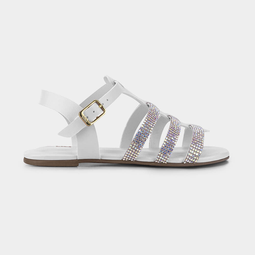 Encante-se com nossa sandália infantil perfeita para as festinhas das meninas! Este modelo, cuidadosamente confeccionado em sintético na cor branca, destaca-se pelas tiras adornadas com pedrarias, adicionando extrema delicadeza. Com fechamento afivelado para segurança no calce, a modelagem exala sofisticação. Desfrute do conforto incomparável com solado super leve e flexível, complementado por uma palmilha que oferece camada extra de espuma para máximo conforto e estabilidade. Adquira agora nossas sandálias femininas que combinam a única de elegância e conforto para suas pequenas fashionistas!