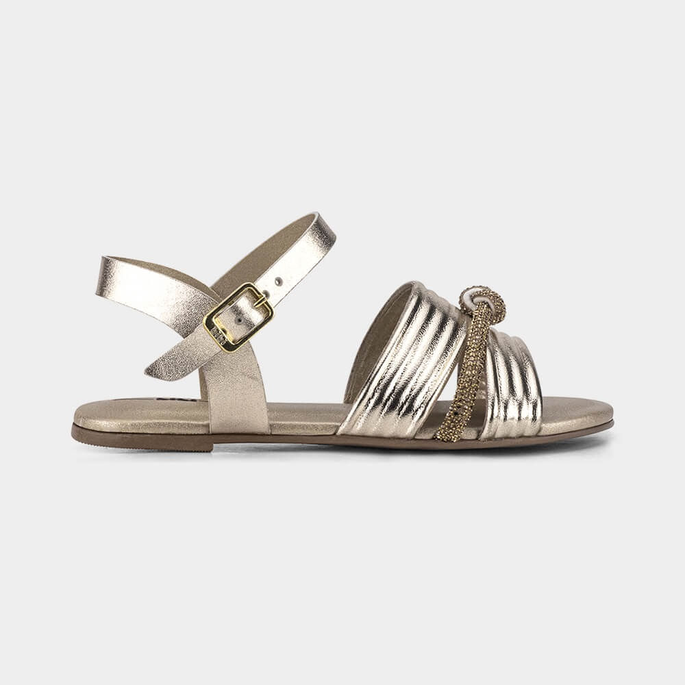Descubra o conforto em grande estilo com nossa sandália para meninas! Esse modelo de sandália feminina apresenta uma gáspea larga para máximo conforto nas festinhas, confeccionada em sintético metalizado ouro com fechamento em fivela para fácil calce. Destaque para a modelagem com detalhe de amassamento e uma tira de strass, proporcionando delicadeza única. O solado leve e flexível, aliado à palmilha com camada extra de espuma, garante conforto e estabilidade excepcionais. Adquira agora nossas sandálias infantis femininas perfeita para ocasiões especiais, unindo elegância e bem-estar.