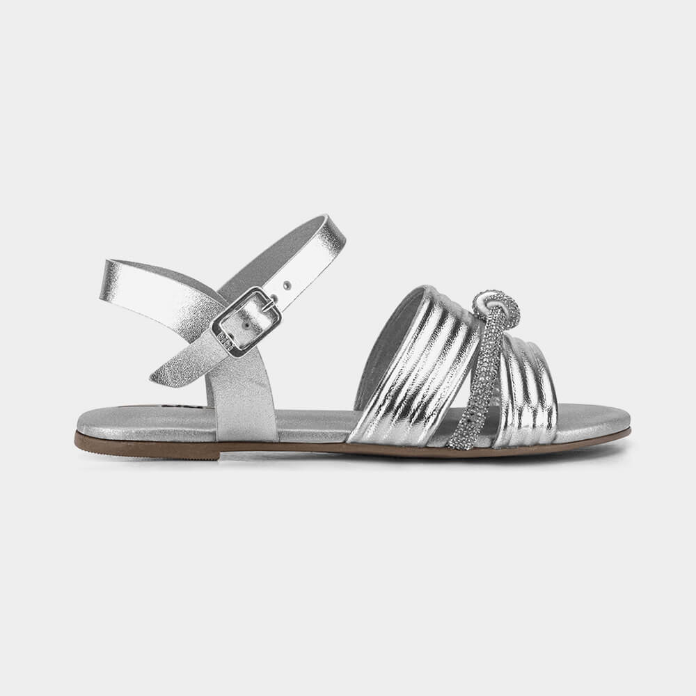 Descubra o conforto em grande estilo com nossa sandália para meninas! Esse modelo de sandália feminina apresenta uma gáspea larga para máximo conforto nas festinhas, confeccionada em sintético metalizado prateado com fechamento em fivela para fácil calce. Destaque para a modelagem com detalhe de amassamento e uma tira de strass, proporcionando delicadeza única. O solado leve e flexível, aliado à palmilha com camada extra de espuma, garante conforto e estabilidade excepcionais. Adquira agora nossas sandálias infantis femininas perfeita para ocasiões especiais, unindo elegância e bem-estar.