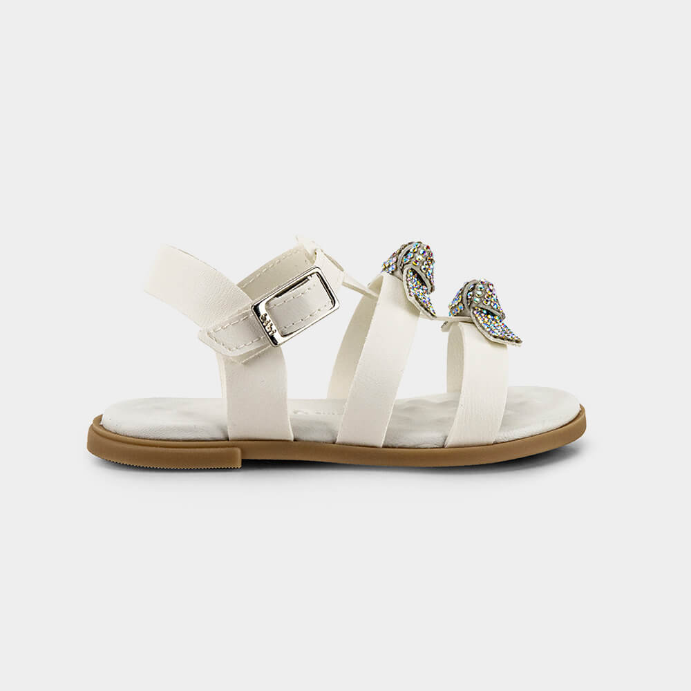 Encontre a sandália feminina perfeita para as meninas que amam andar estilosas! <br> Nossa sandália infantil na cor branca é ideal para festas e eventos especiais. Confeccionada em materiais de alta qualidade, esta sandália possui tiras super delicadas e modernas, adornadas com laços brilhantes, garantindo um visual encantador. <br> A sandália apresenta um ajuste inovador com nova fivela de **calce fácil**, sem pino, proporcionando um ajuste perfeito e confortável aos pés das pequenas. A modelagem é especialmente delicada, pensada para combinar com o estilo e a suavidade das meninas.<br> O solado é extremamente leve e flexível, garantindo liberdade nos movimentos. Além disso, a palmilha **Fisioflex** oferece uma sensação de maciez incrível, semelhante a andar descalço, assegurando o máximo de conforto durante todo o uso.<br> Escolha nossa sandália infantil e faça com que cada festa seja inesquecível com muito conforto e elegância!