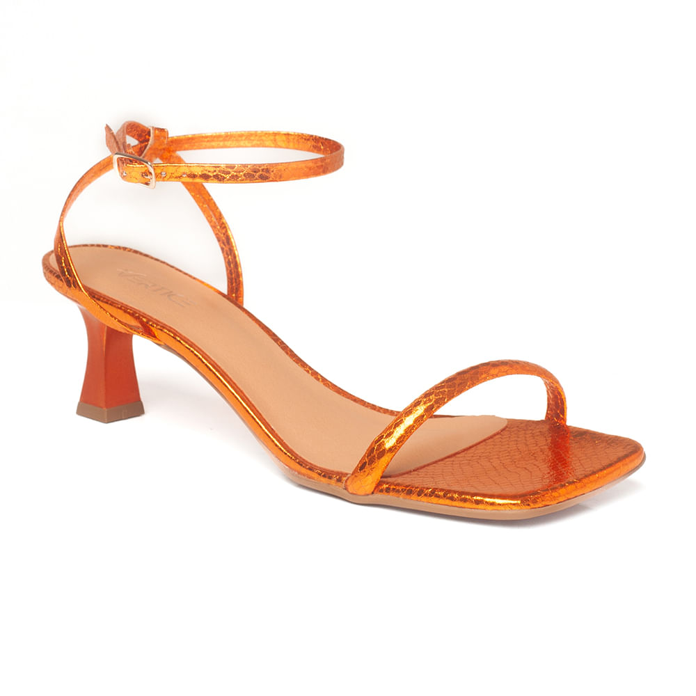 Sandália feminina confeccionada em material de napa e forro sintético; Modelo conta com cabedal em tira única frontal e uma tira fina no tornozelo, com fechamento lateral por fivela; Possui bico quadrado, salto bloco com 3,5 cm de altura e solado em microgel, garantindo durabilidade á sandália; Contém estampa com o nome da marca na palmilha; As sandálias com salto médio são versáteis e combinam com todos os estilos, dos casuais aos mais tradicionais; Aposte em um visual monocromático que alongue sua silhueta, combinando com uma calça de alfaiataria laranja e cropped da mesma cor; As fashionistas amam os saltinhos médios porque eles nunca saem de moda, além de serem confortáveis para usar em diversas ocasiões e com diferentes looks, aposte!<br><br>.<br><br>Produto : Sandália Metalica Laranja <br>Categoria: Sandália<br>Tipo de Salto: Fino <br>Altura do Salto: 3,5 cm<br>Tipo de Bico: Quadrado<br>Material Externo: NAPA<br>Peso: 0,200 g <br>Solado: MICROGEL<br>Forma : Normal compre a sua numeração que costuma usar<br>Cor: Laranja <br>Gênero: Feminino<br>Marca: Vértice<br><br><br>