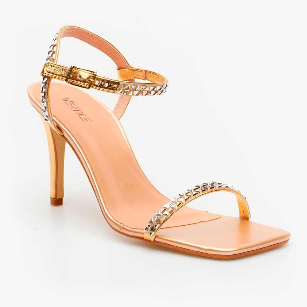 Sandália feminina dourada confeccionada em material sintético PU e solado em Couroplac. Modelo conta com cabedal em tiras frontais e posteriores com aplicações de pedrarias, bico quadrado e salto com 10 cm de altura; Possui fechamento lateral por fivela, palmilha confortável com nome da marca e forro sintético; Perfeitas para usar em qualquer ocasião do seu dia a dia, aposte na sandália dourada com aplicações para um visual moderno; Combine com short de alfaiataria, cropped colorido e um blazer oversized sobreposto; Para arrematar, combinar a cor da bolsa com o do calçado é uma ótima dica de styling; As sandálias femininas com bico quadrado são super confortáveis, não é atoa que se tornou o modelo de calçado favorito das brasileiras amantes de moda e que gostam de conforto no dia a dia.; Aposte!<br><br><br>.<br><br><br>Produto : Sandália Metalica Strass Ouro<br>Categoria: Sandália <br>Tipo de Salto: Fino<br>Altura do Salto: 10 cm<br>Tipo de Bico: Quadrado<br>Material Externo: Sintético<br>Solado : COUROPLAC<br>Forma : Normal compre a que costuma usar<br>Peso:0,444g<br>Cor: Ouro<br>Gênero: Feminino.<br><br><br>Marca: Vértice<br><br>