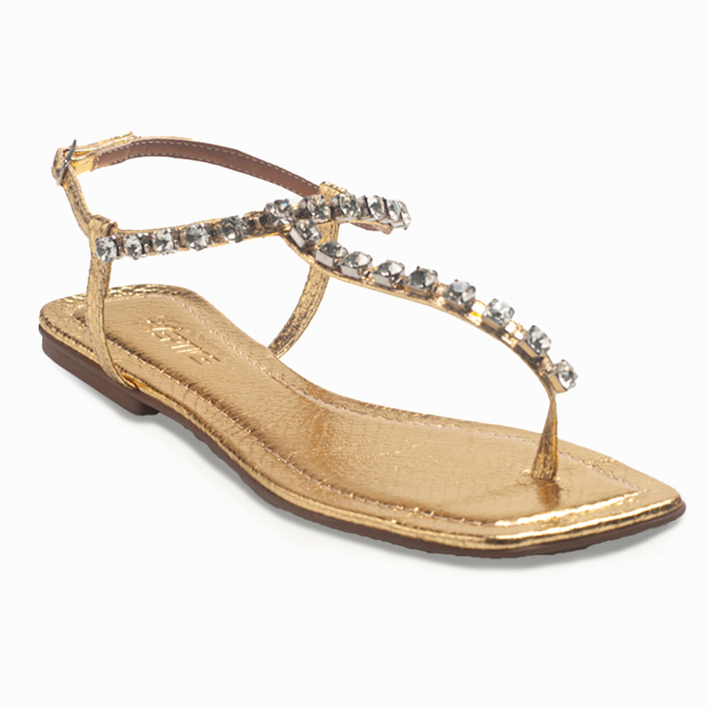 Sandália rasteira feminina confeccionada em napa e forro sintético; Modelo conta com tira de dedo fina com aplicações de pedrarias coloridas, salto baixo com 1,0 cm de altura em solado em microgel e acabamento com brilho ao longo da sandália rasteira; As rasteiras são os calçados oficiais para os dias quentes de lazer; Aposte com tecidos leves e caimentos soltinhos, podendo ser um vestido longo ou uma bermuda de alfaiatara ampla; A sandália rasteira feminina combina com looks diurnos, mas também pode dar o match perfeito no seu visual noturno; As rasteiras femininas são fundamentais para um visual leve e descontraído, mas quando possuem detalhes com pedrarias coloridas elas se tornam únicas e ultra fashionistas, aposte!<br><br>.<br><br>Produto: Sandália Rasteira Pedras Ouro <br>Categoria: Sandalia<br>Tipo de Salto: Sem Salto<br>Altura do Salto: 1,0cm<br>Tipo de Bico: Quadrado<br>Material Externo: Napa<br>Solado: MICROGEL<br>Forma : Normal compre a que costuma usar<br>Peso: 0,264g<br>Cor: Ouro<br>Gênero: Feminino<br>Marca: Vértice<br><br><br><br>