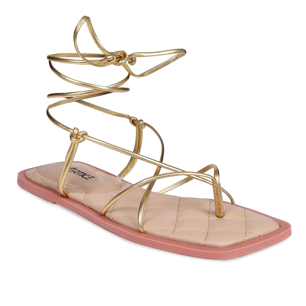 A sandália rasteira com tiras finas e amarração deixa o visual super feminino e valorizando o look.<br>As tiras enroladas no tornozelo trazem delicadeza e feminilidade às composições.<br>Um truque de estilo com a rasteira de amarração que vem dominado o street style, são as tiras até a canela, criando X?s, fazendo com que a amarração seja o ponto alto do look. Traz um ar renovado cheio de personalidade e conforto com a palmilha soft esse estilo de sandália com amarração vai bem com saias e vestidos.<br><br>.<br>Código: 5012968535OUR<br>Categoria: Rasteira <br>Tipo de Salto: Quadrado<br>Altura do Salto: Sem salto<br>Tipo de Bico: Quadrado <br>Material Externo: Sintético<br>Peso: 0,458 g <br>Cor: Ouro<br>Gênero: Feminino <br>Marca: Vértice