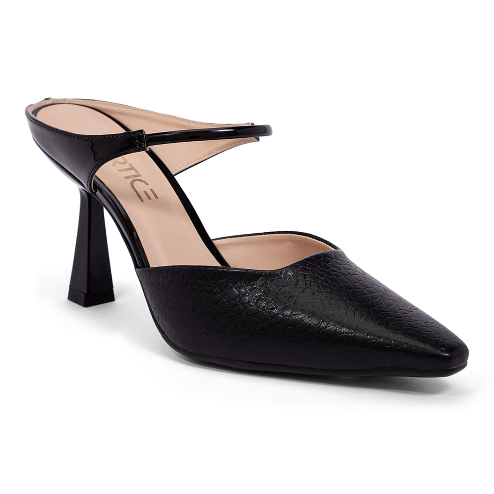 O Scarpin Mule Salto Fino Decote Quadrado com peito do pé coberto tem o salto fino para quem gosta de conforto sem perder o estilo que deixa o calçado muito elegante e versátil, pode ser usado desde um office look quando para um visual mais despojado e casual.<br>O Scarpin Mule Salto Fino Decote Quadrado perfeito com pantacourts saias midi,vestidos tanto os mais fluídos para um mood mais romântico ou mais justos , shorts ou minissaias você consegue um look mais despojado, para um visual mais formal pode usar com blazer ,peças de alfaiataria ,calças flare que alongam a sua silhueta seja qual for a sua escolha você vai arrasar .<br>Os tamancos foram criados na idade Média, na Holanda mais precisamente, eles tinham o solado exclusivamente de madeira que deixava o look mais pesado, o tamanco foi hit nos anos 1970 e 1990 e conquistou as fashionistas e celebridades.<br><br>.<br><br>Produto : Mule Bico Folha Duas Tiras Salto Fino<br>Código :131081970PRT<br>Categoria: Mule<br>Tipo de Salto:<br>Altura do Salto: 9,5 cm<br>Tipo de Bico: Folha<br>Material Externo: Sintético<br>Peso: 0,393 g<br>Solado : Couroplac<br>Forma : Normal compre a sua numeração que costuma usar<br>Cor: Preto<br>Gênero: Feminino<br>Marca: Vértice<br>