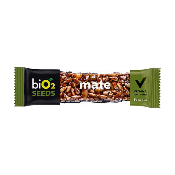 Informações técnicas do produto:<br> <br> O Seeds Mate Bar, da biO2 é uma barra composta pelas sementes de Abóbora e Girassol, com adição de extrato de malte e mate em pó orgânico, coberta por chocolate meio amargo. Uma opção que fornece 6 g de proteínas por barrinha. Livre de glúten, conservantes ou corantes artificiais. <br> <br> Sobre os ingredientes:<br> Mate: fonte de cafeína que favorece mais disposição para realizar atividades diárias, Além de conter antioxidantes que auxiliam contra o combate de radicais livre.<br> Semente de Abóbora e Girassol: contém propriedades antioxidantes e alto teor de proteínas. São ricas em fibras, minerais como o ferro e zinco, ômega 3 e 9, além de vitaminas dos complexos B e E.<br> Vitaminas do complexo B: auxiliam as funções do metabolismo, atuando no metabolismo de proteínas, gorduras e carboidratos.<br> Recomendação de consumo:<br> <br> Ótima opção de lanche saudável para os intervalos das refeições. Seu consumo deve estar associado com a ingestão de líquidos, para auxiliar no funcionamento adequado do intestino.<br> <br> Informações sobre alergênicos:<br> <br> Contém amendoim, soja, amêndoa, avelã, castanha de caju, castanha-do-brasil, macadâmia e pistache.<br> <br> Por que escolher esse produto?<br> Vegana.<br> 6g Proteína Vegetal.<br> Não contém Lactose.<br> Não contém conservantes.<br> Pronto para consumo.<br> Sem Glúten.<br> Sobre a marca: <br> <br> Foi lançada em 2005 a primeira linha de barras de cereais orgânicas certificadas do Brasil, e de lá para cá, sempre inovadora a biO2 traz ao mercado opções de snacks, suplementos, barrinhas, sucos, nutracêuticos, mix de cereais, balas energéticas entre outros, sempre pensando na valorização dos ingredientes.