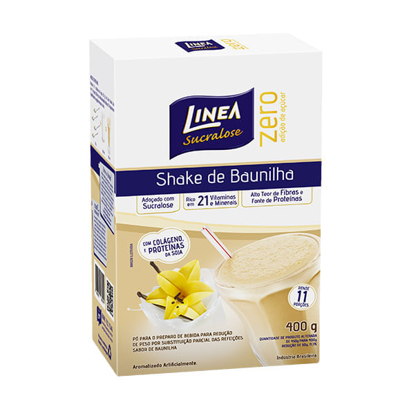 Informações técnicas sobre o produto:<br> O Shake premium sabor baunilha, da Linea, 400g, é delicioso e completo, possui 23 vitaminas e minerais, whey protein, colágeno e carboidratos! Pode substituir até duas refeições, ou até mesmo, complementá-las.<br> <br> Recomendação de consumo:<br> Misture 3 ½ colheres de sopa (35 g) de Linea Shake em 1 ½ copo (300 ml) de leite desnatado.<br> <br> Bata por 30 segundos em liquidificador ou agitador manual e prontinho. É só beber!<br> <br> Alergênicos:<br> Contém lactose, derivados de soja e leite. Pode conter amendoim.<br> <br> Por que escolher esse produto?<br> Zero açúcar<br> Fonte de proteínas<br> Fonte de fibras<br> Fonte de colágeno<br> 23 vitaminas e minerais<br> Sobre a marca:<br> A Linea surgiu para inspirar as pessoas a terem mais qualidade de vida e para transformar a visão sobre alimentação saudável, oferecendo mais sabor, prazer e segurança por meio de seus produtos! Acreditam em uma vida mais saudável livre de restrições.