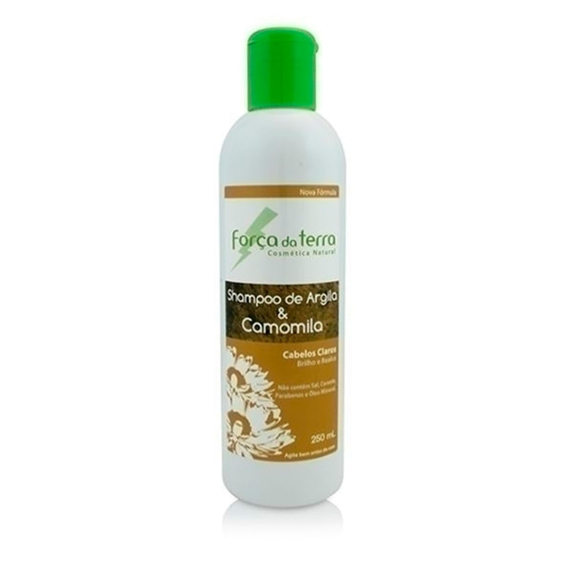 O Shampoo de Argila e Camomila, da Força da Terra, é ótimo para hidratar, proporcionar mais brilho e realçar os reflexos naturais dos nossos cabelos.<br> <br> O uso da argila para tratamentos estéticos é bastante indicado. Rica em sais minerais como zinco, potássio, cálcio e ferro, nos cabelos, a argila é eficiente contra seborreia (oleosidade), caspa e queda.<br> <br> Já a camomila, além de ser uma planta com ação calmante, ela é excelente para realçar a cor dos cabelos castanho claro e loiro, natural ou tratado quimicamente. Os reflexos dourados que vão surgindo no cabelo ficam ainda mais bonitos com o processo gradativo.<br> <br> O Shampoo de Argila e Camomila, da Força da Terra é indicado para todos os tipos de cabelo. Também aproveita matérias primas renováveis, embalagem biodegradável e opaca, que protege os princípios ativos da luz solar. Não é testado em animais e nem utiliza-se ingredientes dessa origem. Além disso, não contém sal, corante, parabenos e óleo mineral.<br> <br> Modo de usar: Agite bem, aplique sobre o cabelo molhado, massageie e enxágue. Para melhor resultado repita a operação e use o condicionador de Camomila, da Força da Terra.