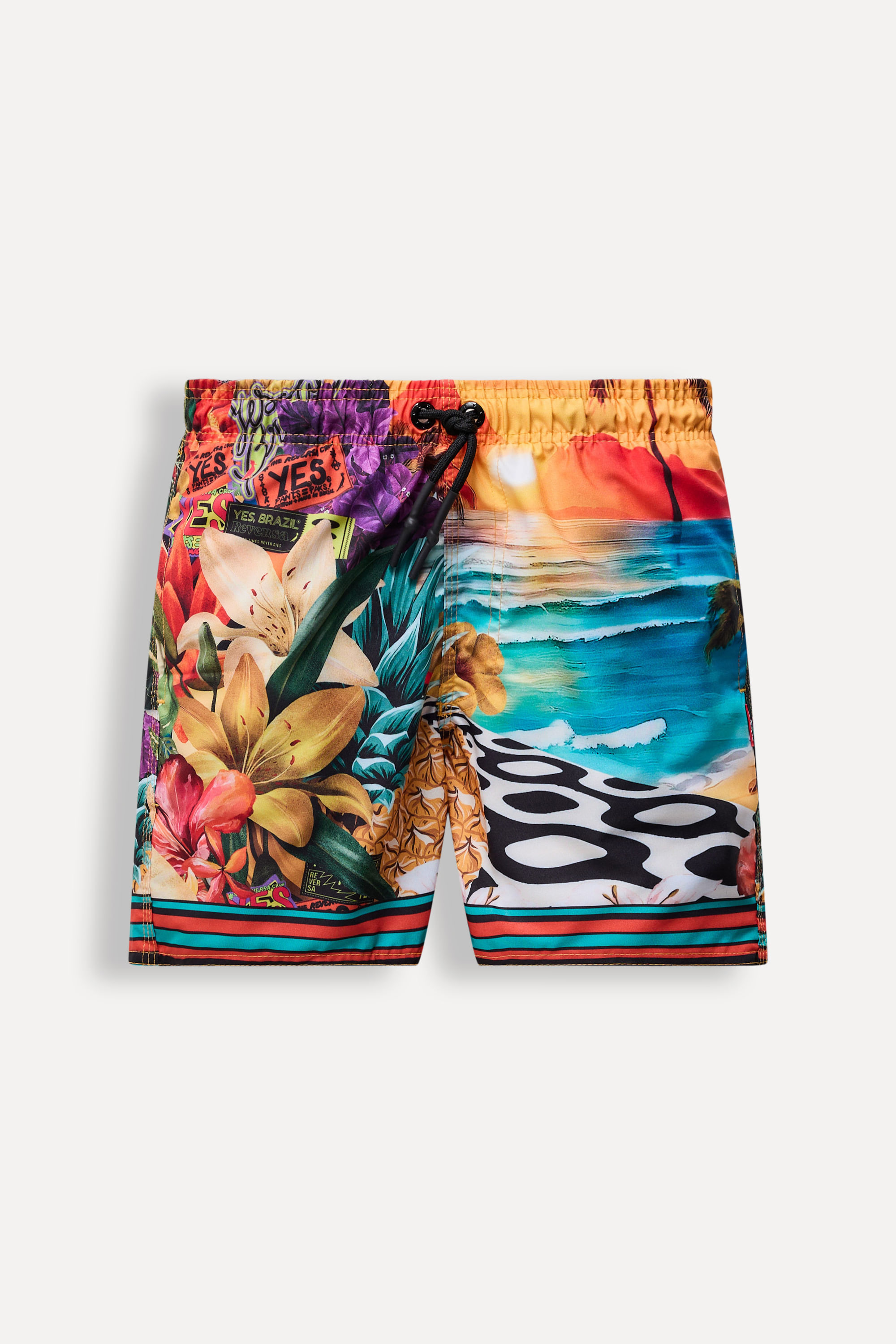 O Short Praia Reserva Mini Yes veio pra mostrar que dá pra ter estilo desde pequeno! Feito em tecido tecnológico com secagem rápida, ele é perfeito para um tchibum. Seu cós é de elástico e possui ajuste com cadarços e saída de ilhós. Possui também bolsos embutidos na frente, com forro interno de tela para escoar a areia, e um bolso traseiro com ilhós para escoar a água durante o mergulho. Sua estampa traz uma paisagem tropical, com cores bem vivas. Combine com a Camisa Praia Reserva Mini Yes e tenha um look completo! Comprando esta peça, você viabiliza cinco pratos de comida através do nosso Programa 1P5P. Short produzido eticamente no Brasil.