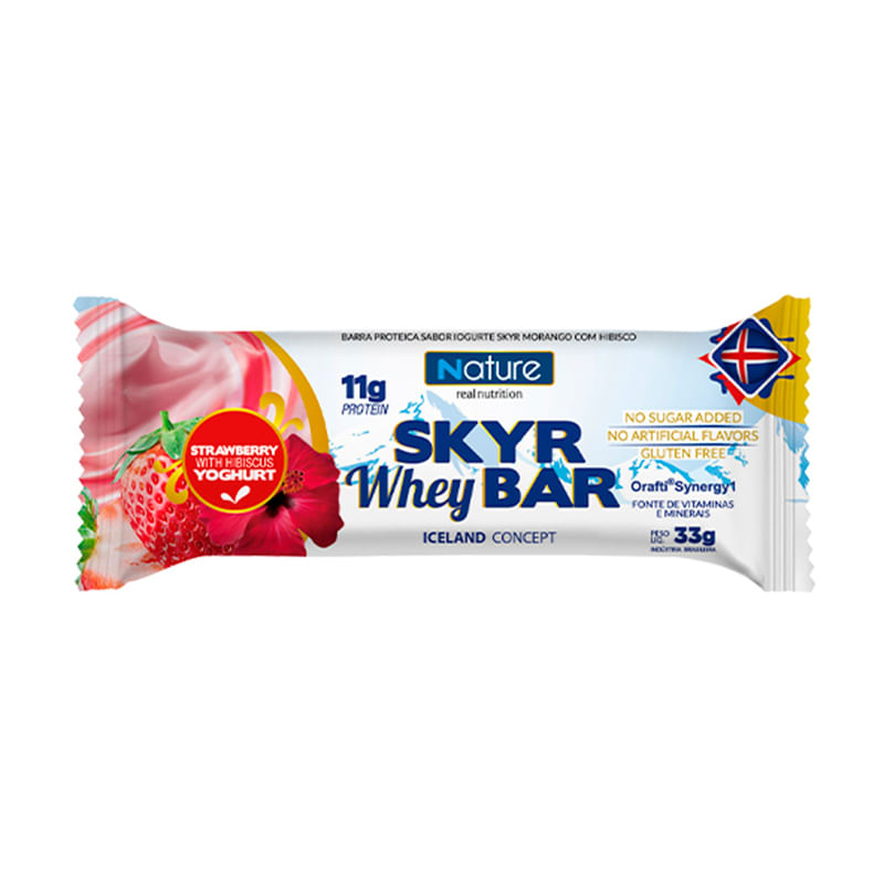 Informações técnicas do produto:<br> A Barrinha proteica Skyr whey bar morango da Nutrata, é a opção perfeita para matar aquela vontade de comer doce de uma forma mais saudável. Cada porção contém 11g de proteína. <br> A barrinha é livre de conservantes, corantes e aromatizantes artificiais. Além disso as porções individuais são ideais para transportar e ter sempre à mão onde quer que esteja!<br> Recomendação de uso: <br> É uma excelente e prática opção de lanche para levar na bolsa, na mochila, no carro, na academia, no trabalho. Pode ser consumida a qualquer horário do dia, também uma ótima alternativa para aqueles momentos que bate uma vontade de comer um doce.<br> Por que escolher esse produto?<br> Produto prático<br> Produto 100% natural<br> Livre de corantes artificiais<br> Livre de conservantes<br> Sem glúten<br> Sem açúcar<br> Sobre a marca: <br> A Nutrata com sua experiência de mais de 20 anos gera confiança e credibilidade com a qualidade dos seus produtos. Seu objetivo é atingir todos os tipos de público que buscam uma qualidade de vida melhor ou que necessitam de produtos específicos e de alta performance.