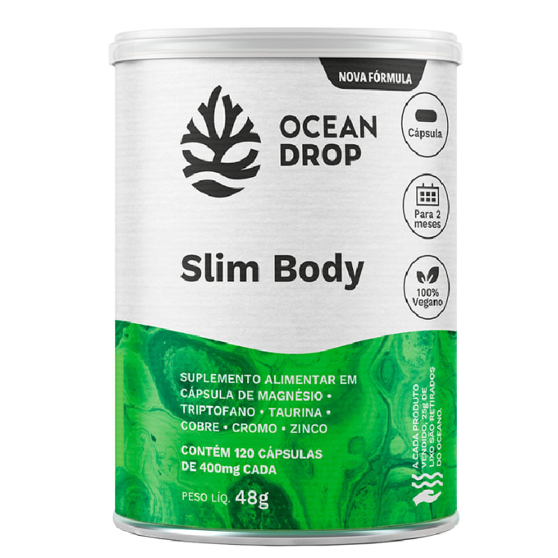<p>O <strong>Slim Body da Ocean Drop </strong>é um suplemento alimentar em cápsulas elaborado ativos naturais, nele contém magnésio, triptofano, taurina, e os minerais zinco, cromo e cobre, isso em uma fórmula 100% vegana e sem glúten.</p> <h2><strong>Sugestão de consumo:</strong><strong> </strong></h2> <p>Consumir 2 cápsulas ao dia, ou conforme recomendação do médico ou nutricionista.</p> <h2><strong>Motivos para escolher o produto:</strong></h2> <ul> <li> <p>200mg de taurina por dose;</p> </li> <li> <p>Contém zinco e cobre em forma de bisglicinato: melhor absorção;</p> </li> <li> <p>100mg de triptofano por dose;</p> </li> <li> <p>Rende até 60 doses;</p> </li> <li> <p>100% vegano;</p> </li> <li> <p>Sem glúten e sem lactose;</p> </li> </ul> <h2><strong>A Marca:</strong></h2> <p>A Ocean Drop tem a missão de conectar você ao oceano através de suplementos veganos de alta qualidade. A empresa foi fundada em 2016 por 4 oceanógrafos que firmaram um compromisso com a sociedade e o meio ambiente, projetos como Doe Vitaminas e Missão Oceano são apoiados pela Ocean Drop.</p> <p> </p>