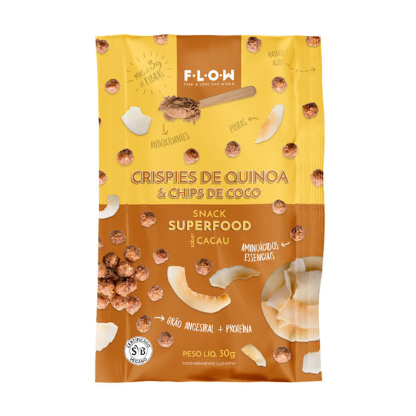 Informações técnicas do produto:<br> O Snack crispies quinoa e chips sabor coco e cacau, da Flow Foods, 30 g, é um petisco orgânico, que fornece 2,9 g de proteínas.<br> <br> Snack vegano, crocante e sem glúten, feito a partir crispies de quinoa, um grão ancestral que possui muitos nutrientes. Caramelizado com açúcar demerara orgânico e cacau orgânico.<br> <br> Recomendação de consumo:<br> Pode ser consumido a qualquer hora do dia, uma dica é consumi-lo no café da manhã, substituindo o cereal convencional.<br> <br> Por que escolher esse produto?<br> 141 kcal por pacote<br> 2,9 g de proteínas<br> Não possui glúten<br> Certificado vegano<br> Possui aminoácidos essenciais<br> Possui antioxidantes<br> Mais de 3g de fibras<br> Certificado orgânico<br> Sobre a marca:<br> A Flow Foods propõe aos seus clientes um estilo de vida saudável e um consumo consciente dos alimentos, com o intuito de incentivar o questionamento sobre o impacto da produção dos seus ingredientes no planeta. Não utilizam produtos de origem animal, o que permite que a marca tenha certificado e selo vegano pela Sociedade Vegetariana Brasileira.