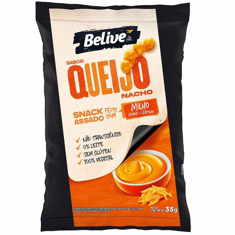 <p>O <strong>Snack de Milho sabor Queijo Nacho</strong>, da <strong>Belive, </strong>é um salgadinho assado elaborado com quinoa, lentilha<strong>, </strong><strong>farinha de arroz e farinha de soja integral (soja não transgênica)</strong>, ingredientes naturais ricos em nutrientes, tais como carboidratos, proteínas, gorduras boas, vitaminas e minerais.</p> <strong>Recomendação de consumo:</strong> <p>Pode ser consumido nos lanches, nos intervalos das principais refeições (café da manhã, almoço e jantar).</p> Alérgicos: <p>Contém derivados de soja.</p> Por que escolher este produto? <ul> <li>Isento de aromas artificiais</li> <li>96 kcal na porção</li> <li>Não é frito (é assado)</li> <li>Composto por sal light</li> <li>Teor de sódio reduzido em 50%</li> <li>0% de gordura trans</li> <li>Sem glúten</li> <li>Sem lactose</li> </ul> Sobre a marca: <p></p> <p>A BeLive Be free, é uma marca que acredita que para ser livre, é preciso ter escolhas saudáveis e saborosas. É dar espaço para a alegria da liberdade de comprar o que você realmente gosta. É comprar o produto sem medo e comer sem culpa.</p>