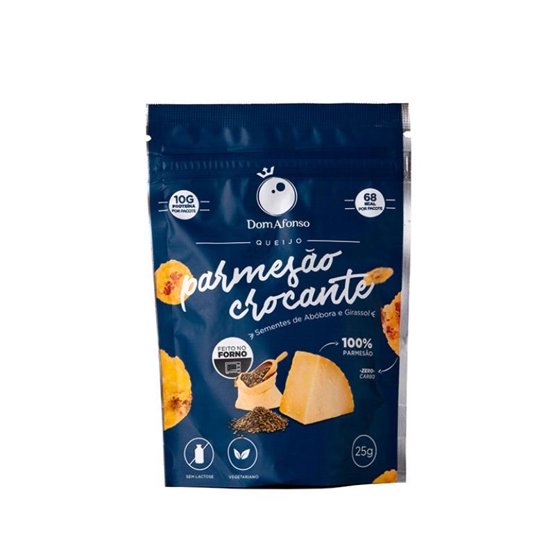 <h2 style="text-align: justify;"><strong>Queijo Parmesão Abóbora e Girassol Dom Afonso 25g</strong></h2> <p style="text-align: justify;">O <strong>Queijo parmesão crocante </strong>com semente de abóbora e girassol Dom<strong> Afonso</strong> é um snack assado e crocante, feito para eliminar parte da gordura e concentrar o sabor umami do queijo. Ótima opção de snack pois é prático, saudável, saboroso e versátil para qualquer hora do dia.</p> <h2 style="text-align: justify;"><strong>Sugestão de consumo:</strong></h2> <p style="text-align: justify;">Adicione em saladas ou sopas, no almoço ou jantar, para mais crocância e sabor levemente adocicado e picante à sua refeição. Também é um excelente lanche rápido e vai muito bem até mesmo no happy hour. Pode ser consumido em dietas cetogênicas e dietas low carb.</p> <h2 style="text-align: justify;"><strong>Motivos para escolher o produto:</strong></h2> <p style="text-align: justify;">● Parmesão de 6 meses</p> <p style="text-align: justify;">● São 10g de proteína e 68kcal por porção </p> <p style="text-align: justify;">● Assado no forno</p> <p style="text-align: justify;">● Zero Carbo</p> <p style="text-align: justify;">● Vegetariano</p> <p style="text-align: justify;">● Sem Glúten</p> <p style="text-align: justify;">● Sem Lactose</p> <p style="text-align: justify;">● Sem Conservantes</p> <h2 style="text-align: justify;"><strong>A Marca</strong></h2> <p style="text-align: justify;">Dom Afonso produz Manteiga Ghee, grass fed; Snack de Parmesão Crocante, zero carboidratos e Pasta de Castanha de Caju 100% integral. Todos os produtos são considerados clean label - sem conservantes, sem aditivos químicos, sem corantes e sem aromatizantes.</p>