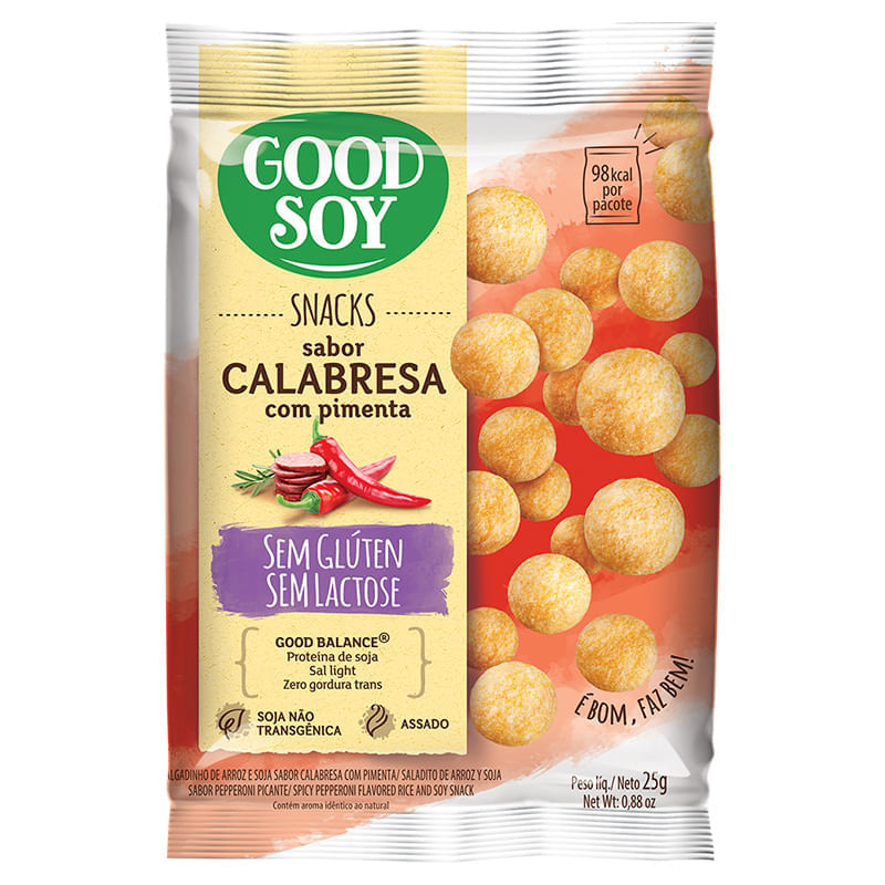 <p>O <strong>Snack de Soja Calabresa com Pimenta Good Soy 25g </strong>é um salgadinho elaborado com farinha de arroz e farinha de soja integral (soja não transgênica), ingredientes naturais ricos em nutrientes, tais como carboidratos, proteínas, gorduras boas, vitaminas e minerais, além de ser crocante, leve e muito saboroso.</p> Sobre os ingredientes: <p>Farinha de arroz, farinha integral de soja não transgênica, óleo vegetal (palma, soja), condimento preparado sabor calabresa, sal light, corante urucum e pimenta vermelha.</p> <p>Não contém Glúten.</p> Sobre a marca: <p>A <strong>Good Soy</strong> traz ao mercado uma variedade de alimentos à base de soja, que contribuem para deixar nossas refeições ainda mais nutritivas, mas sem perder o sabor! A marca dispõe de diversas opções de snacks, brownies, cookies, salgadinhos e pães de mel, que podem substituir, de forma saudável, as versões tradicionais encontradas no mercado.</p>