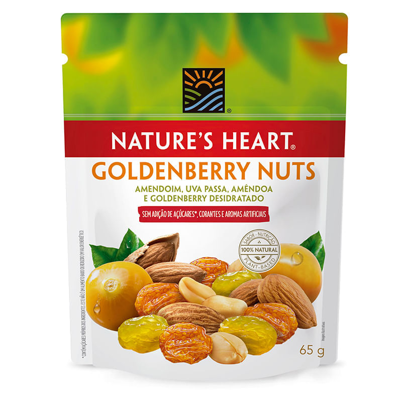 Informações técnicas do produto:<br> O Snack Goldenberry Nuts, da Nature’s Heart, 65g, é 100% natural, uma ótima opção saborosa de snack para todas as pessoas que buscam uma alimentação saudável e balanceada. Além da Goldenberry, contém também amendoim, uva passa e amêndoas e não tem adição de açúcares. Cada porção fornece 1,5 g de fibras.<br> Sobre os ingredientes:<br> Goldenberry: Conhecida por alguns como Physalis, a Goldenberry é excelente fonte de ferro, benéfica principalmente para vegetarianos e veganos. Além disso contém fibras, cálcio, fósforo, proteínas, carboidratos, flavonoides e vitaminas A e C. Sendo considerada um dos alimentos de origem vegetal mais completos da atualidade.<br> Amendoim: Rico em ácidos graxos mono e poli-insaturados, proteína e fibras, além de fonte de ferro, vitaminas A e E, e compostos com função antioxidante.<br> Recomendação de consumo:<br> Snacks ideais para lanches rápidos e para serem consumidos nas refeições intermediárias.<br> Informações sobre alergênicos:<br> Contém amêndoa e amendoim. Pode conter nozes, pecãs e castanha-de-caju.<br> Por que escolher esse produto?<br> 100% natural<br> Sem glúten<br> Plant Based<br> Sem adição de açúcares<br> 73 kcal por porção<br> Sem gorduras trans<br> Sem corantes e aromas artificiais<br> Sobre a marca:<br> A Nature’s Heart busca os melhores sabores no coração da natureza. Possui uma seleção dos melhores e mais nutritivos ingredientes e dos mais saborosos frutos. Além disso, contribui para a melhoria de vida de milhares de famílias de pequenos agricultores.<br>