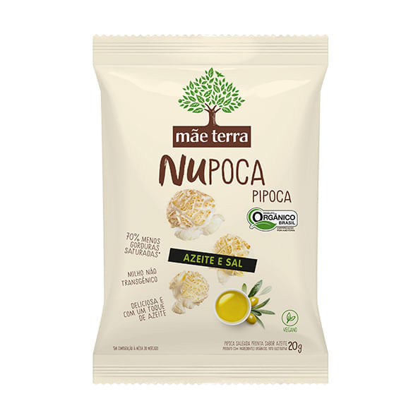 Informações técnicas do produto:<br> A Nupoca azeite e sal, da Mãe Terra, 20g, é uma pipoca feita com ingredientes orgânicos, com o mínimo de processamento, livre de qualquer aditivo artificial e de transgênicos.<br> <br> Temperada com azeite de oliva e sal moído, estourada no ar quente, é um snack vegano saboroso e naturalmente fonte de fibras.<br> <br> Recomendação de consumo:<br> A pipoca da Mãe Terra é ideal para os lanchinhos entre as refeições. O pacotinho com porção individual facilita o consumo.<br> <br> Por que escolher esse produto?<br> Orgânico<br> 2,6g de fibras no pacote<br> Sem lactose<br> Vegano<br> Sem açúcar<br> Livre de transgênicos<br> Sem sabor artificial<br> Estourada no ar<br> Integral<br> Sobre a marca:<br> A Mãe Terra surgiu com a proposta de trazer alimentos mais naturais e saudáveis para seus consumidores, utilizando ingredientes orgânicos sempre que possível. Minimamente processados e livre de transgênicos, esses alimentos são ricos em nutrientes como vitaminas, minerais, fibras e proteínas, importantes para o funcionamento do nosso organismo.