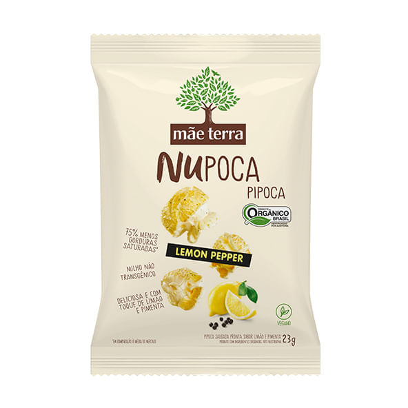 Informações técnicas do produto:<br> A Nupoca Lemon Pepper, da Mãe Terra, 23g, é uma pipoca feita com ingredientes orgânicos, com o mínimo de processamento, livre aditivos artificiais e de transgênicos.<br> <br> Temperada com um toque de limão e pimenta, estourada no ar quente, é um snack vegano delicioso e naturalmente fonte de fibras.<br> <br> Alérgicos:<br> Contém derivados de soja. Pode conter aveia, centeio, cevada, trigo, amêndoa, amendoim, avelã, castanhas, castanha de caju, castanha do pará, gergelim, macadâmia, nozes, pecã, pistache, leite e ovo.<br> <br> Recomendação de consumo:<br> A pipoca da Mãe Terra é ideal para os lanchinhos entre as refeições. O pacotinho com porção individual facilita o consumo.<br> <br> Por que escolher esse produto?<br> Orgânico<br> Sem lactose<br> Vegano<br> Estourado no ar<br> Integral<br> Livre de transgênicos<br> Sem sabor artificial<br> Sobre a marca:<br> A Mãe Terra surgiu com a proposta de trazer alimentos mais naturais e saudáveis para seus consumidores, utilizando ingredientes orgânicos sempre que possível. Minimamente processados e livre de transgênicos, esses alimentos são ricos em nutrientes como vitaminas, minerais, fibras e proteínas, importantes para o funcionamento do nosso organismo.