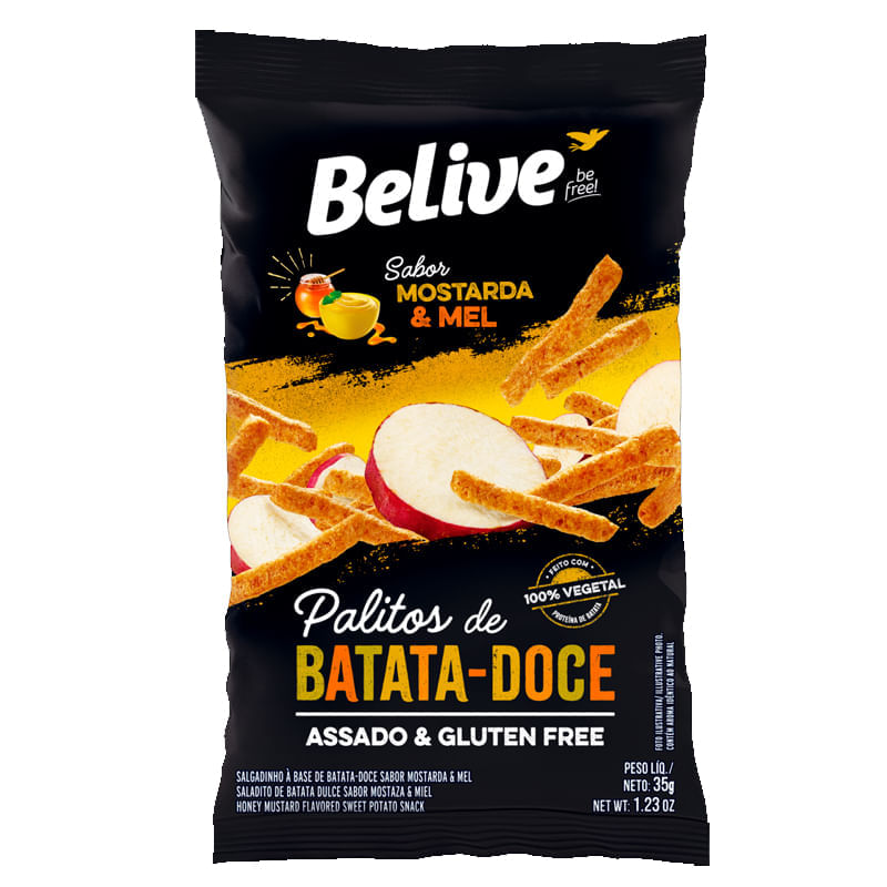 <p>Informações técnicas do produto:<br>O Snack de Batata Doce Sabor Mostarda e Mel, da Belive, 35g, é um salgadinho assado à base de batata doce integral e proteína isolada de batata, fornecendo 4,1g de proteína na porção. Os palitos de batata doce, são crocantes e deliciosos, que diferente das versões tradicionais, são temperados com sal light, com teor de sódio reduzido em 50%, além de não conter glúten e lactose.<br><br>Recomendação de consumo:<br>Pronto para o consumo, ótima opção de snack que pode ser consumido na escola, na academia, no trabalho ou em qualquer outro lugar a qualquer momento do dia.<br><br>Informações sobre alergênicos:<br>Contém derivados de soja.<br><br>Por que escolher esse produto?<br>Sem glúten<br>Sem lactose<br>Produto assado: baixo teor de gordura<br>Com proteína isolada de batata<br>Sobre a marca:<br>A BeLive Be free, é uma marca que acredita que para ser livre, é preciso ter escolhas saudáveis e saborosas. É dar espaço para a alegria da liberdade de comprar o que você realmente gosta. É comprar o produto sem medo e comer sem culpa.</p>