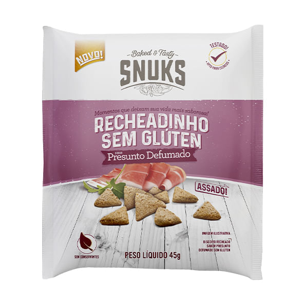 <br> Os Snuks recheadinhos de presunto defumado sem glúten, d<p>A Schär, 45g, são snacks leves, crocantes e deliciosos! Feitos sem ovos e sem glúten, são uma ótima opção para alérgicos ou intolerantes a estes componentes.<br> <br> Alergênicos:<br> Contém amendoim. Contém derivados de leite e soja. Contém lactose.<br> <br> Benefícios:<br> Sem glúten<br> Sem ovos<br> Pronto para consumo<br> Sem conservantes<br> </p>A marca:<br> A Schär possui 35 anos de experiência e dedicação exclusiva à fabricação de produtos sem glúten. Todos os produtos são sem conservantes ou qualquer outro aditivo artificial ou ingrediente transgênico. E, toda linha de produtos Schär são certificadamente sem glúten, pois possui todas as certificações internacionais existentes, assegurando total tranquilidade ao consumidor que precisa ou opta por seguir uma dieta sem glúten.