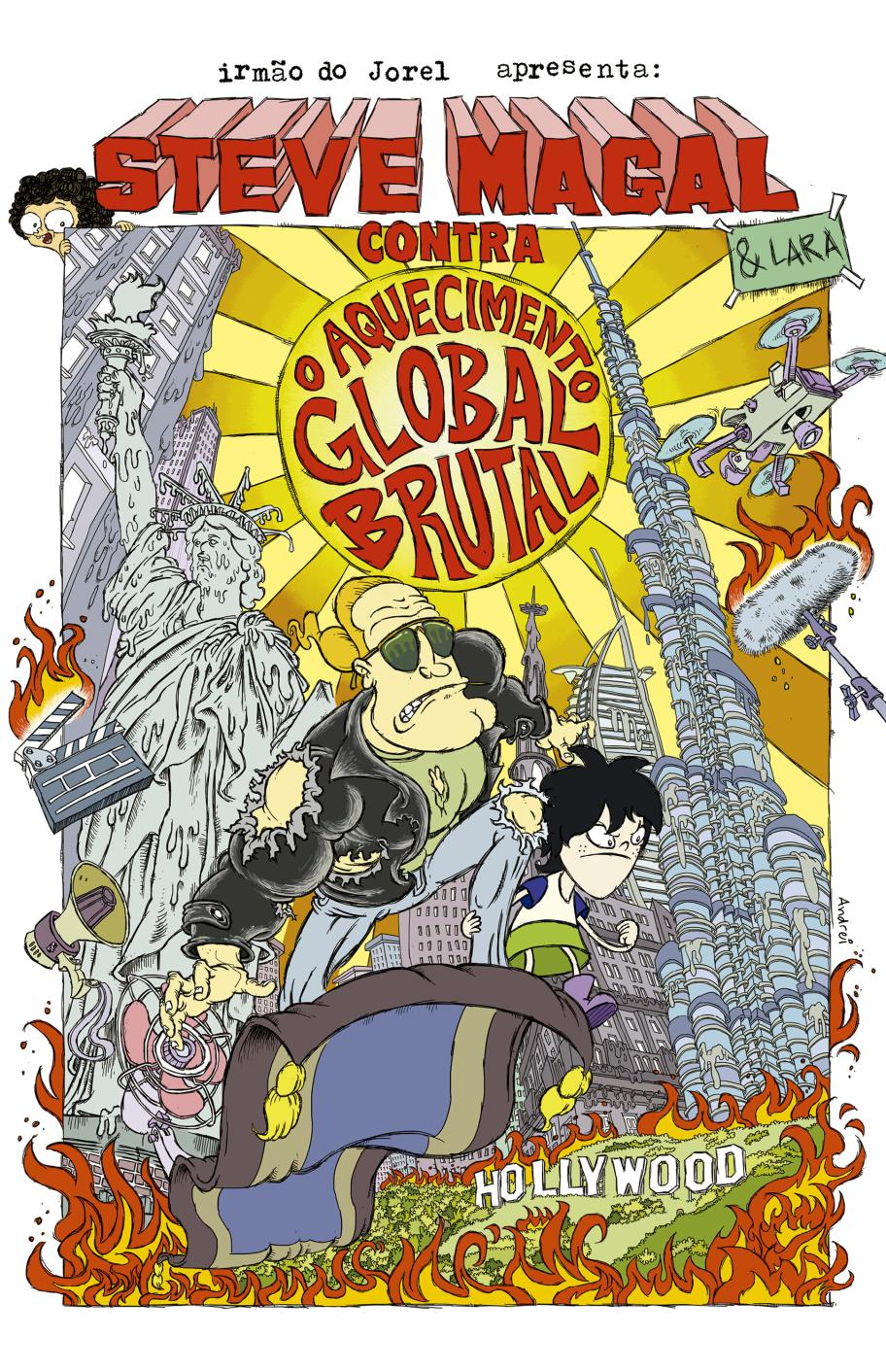 No segundo livro do Irmão do Jorel, sua família descobre pela televisão que a humanidade será extinta em três dias por causa do calor. A nossa sorte é que esse não é um filme só do Irmão do Jorel… É um filme do Steve Magal, a maior estrela dos filmes de ação de todos os tempos! O ator está em crise tanto na vida profissional quanto pessoal e aceita o convite de estrelar um filme sobre o fim do mundo enquanto o mundo acaba de verdade. No entanto, Steve Magal não se sente inspirado a viver o tempo todo no papel de herói, até encontrar Lara, uma criança que decidiu salvar de verdade o mundo por conta própria. Juntos, eles irão lutar contra o Aquecimento Global Brutal participando de um torneio de kickboxing pela paz mundial na ONU, atravessando Nova York em chamas num tapete voador, dando piruetas desnecessárias num caça supersônico, resgatando um cãozinho influencer em Hollywood, fugindo de pacifistas radicais, lutando contra soldados paparazzi, enfrentando a cobrança de fãs e ex-fãs fanáticos, refletindo sobre as reivindicações plausíveis de roteiristas em greve, cruzando o continente americano de jet-ski no asfalto quente e desfilando no tapete vermelho em brasas na última edição do Oscar! Mas o misterioso diretor bilionário por trás do último filme do mundo está disposto a usar um programa de inteligência artificial brutal para terminar sua obra, mesmo que para isso precise exterminar quem se recusa a seguir um roteiro. A única certeza que Steve Magal tem é que se tudo der errado, existe um fã sempre pronto para defendê-lo até o fim: o Irmão do Jorel.
