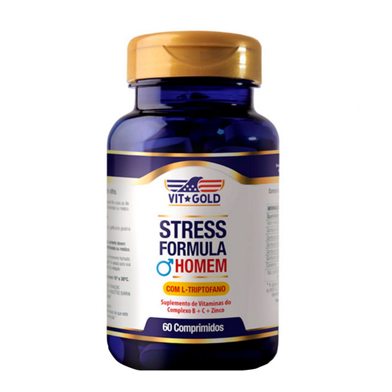 Informações técnicas do produto:<br> <br> O Stress Formula Homem, da VitGold, é um suplemento multivitamínico e mineral com 60 comprimidos que, além de conter vitaminas e minerais essenciais para a manutenção da saúde do homem, contém triptofano, um aliado ao controle do estresse.<br> <br> Recomendações de consumo:<br> <br> <br> Recomenda-se tomar 1 comprimido de Stress Formula Homem ao dia, durante a refeição principal.<br> <br> Consulte um nutricionista ou médico para adequar às suas necessidades específicas.<br> <br> Por que escolher este produto:<br> Prático<br> Seguro<br> Fornece 50mg de triptofano por comprimido<br> Não contém glúten<br> Não contém açúcar<br> Livre de corantes e aromatizantes<br> Livre de conservantes<br> Sobre a marca:<br> <br> A VitGold é uma empresa de suplementos vitamínicos e minerais dos Estados Unidos, com atividades no Brasil desde 1994. Seus produtos são produzidos em laboratórios credenciados e validados por órgãos como a FDA nos Estados Unidos e a ANVISA no Brasil, garantindo a qualidade dos suplementos.