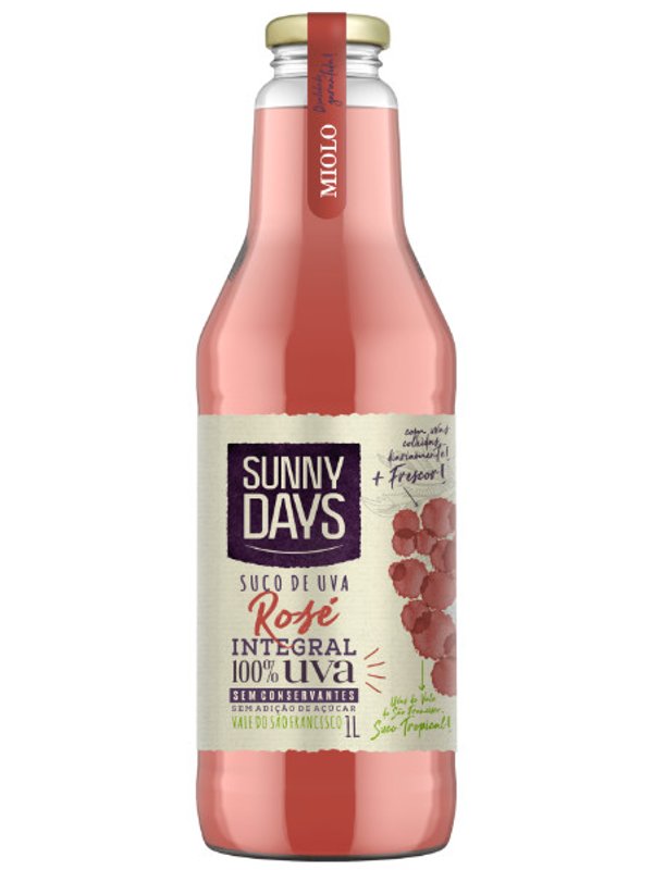 VOCÊ ESTÁ COMPRANDO: SUCO DE UVA SUNNY DAYS ROSÉ INTEGRAL 300ML<br /> ORIGEM: BRASIL<br /> <br /> SOBRE O PRODUTO<br /> <br /> Suco de uva integral, sem adição de açúcar, sem conservantes, elaborado com as variedades de uvas Moscatel, Grenache e Syrah, plantadas na região de viticultura tropical vale do são Francisco, Bahia.<br /> <br /> O suco de uva integral Sunny Days, ideal para acompanhar todos os tipos de alimentos, em especial lanches saudáveis e leves. Também é excelente se apreciado sozinho, pois é nutritivo e saboroso.<br /> <br /> Região<br /> Vale do São Francisco / BA<br /> <br /> Tipo<br /> Rosé<br /> <br /> Uva<br /> Grenache / Syrah / Moscato<br /> <br /> Classificação<br /> Doce<br /> <br /> Amadurecimento<br /> Sem Informação<br /> <br /> Temperatura Serviço<br /> 8º a 10ºC<br /> <br /> Potencial de Guarda<br /> Sem Informação<br /> <br /> Método<br /> Sem Informação<br /> <br /> Visual<br /> Possui uma coloração intensa com fortes reflexos roxo-violáceos.<br /> <br /> Olfativo<br /> Amoras e framboesas silvestres.<br /> <br /> Gustativo<br /> Paladar intenso, de agradável equilíbrio ácido-doce, ótimo frescor.