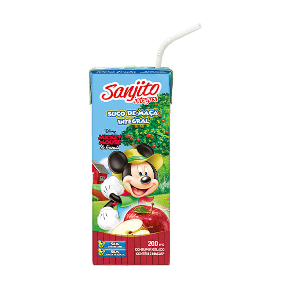 Informações técnicas do produto:<br> O Suco integral de maçã Disney, da Sanjito, 200ml, é feito apenas com maçãs (Fuji e Gala), livre de aditivos químicos, sem adição de açúcar ou água.<br> <br> Integral e 100% natural, é uma opção prática e saborosa para o lanche saudável das crianças e de toda família.<br> <br> Recomendação de consumo:<br> Embalagem prática Tetra Pack em porção individual de 200 ml, ideal para a lancheira saudável e piqueniques. Consuma gelado.<br> <br> Por que escolher esse produto?<br> Sem adição de açúcar<br> Sem conservantes<br> Sem corantes<br> Sem adição de água<br> Integral<br> Sobre a marca:<br> A Sanjito é uma linha da Sanjo, uma Cooperativa Agrícola que investe em qualidade e tecnologia. A Sanjo atua desde 1993 na produção de maçãs e, mais recentemente, na produção de uva, goiaba da serrana e mirtilo, além de desenvolver bebidas à base de frutas, como sucos, vinhos e espumantes. Com um rígido controle de qualidade, a empresa possui o selo de Produção Integrada do Inmetro, que garante a qualidade da fruta em todas as fases de produção, armazenagem e classificação.