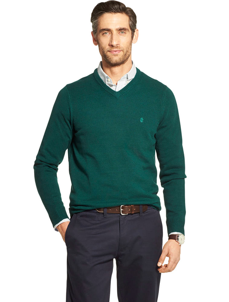 O suéter básico em tricot verde escuro da IZOD tem decote V e é uma ótima opção para dias mais frios. Pode ser usado sobre camisa , t-shirt ou polo. Pode ser e usado no trabalho e nos finais de semana .Tem algodão em sua composição e não é pesado.