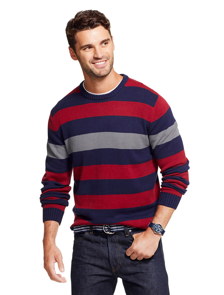 O suéter em tricot da Izod tem 2 faixas listradas horizontais no peito Em bordô , grafite e detalhes em azul marinho . Com decote redondo é uma opção moderna para dias mais frios e pode ser coordenada com uma calça chino, ou uma calça jeans. É em 100% algodão , fácil de lavar e secar e muito confortável.